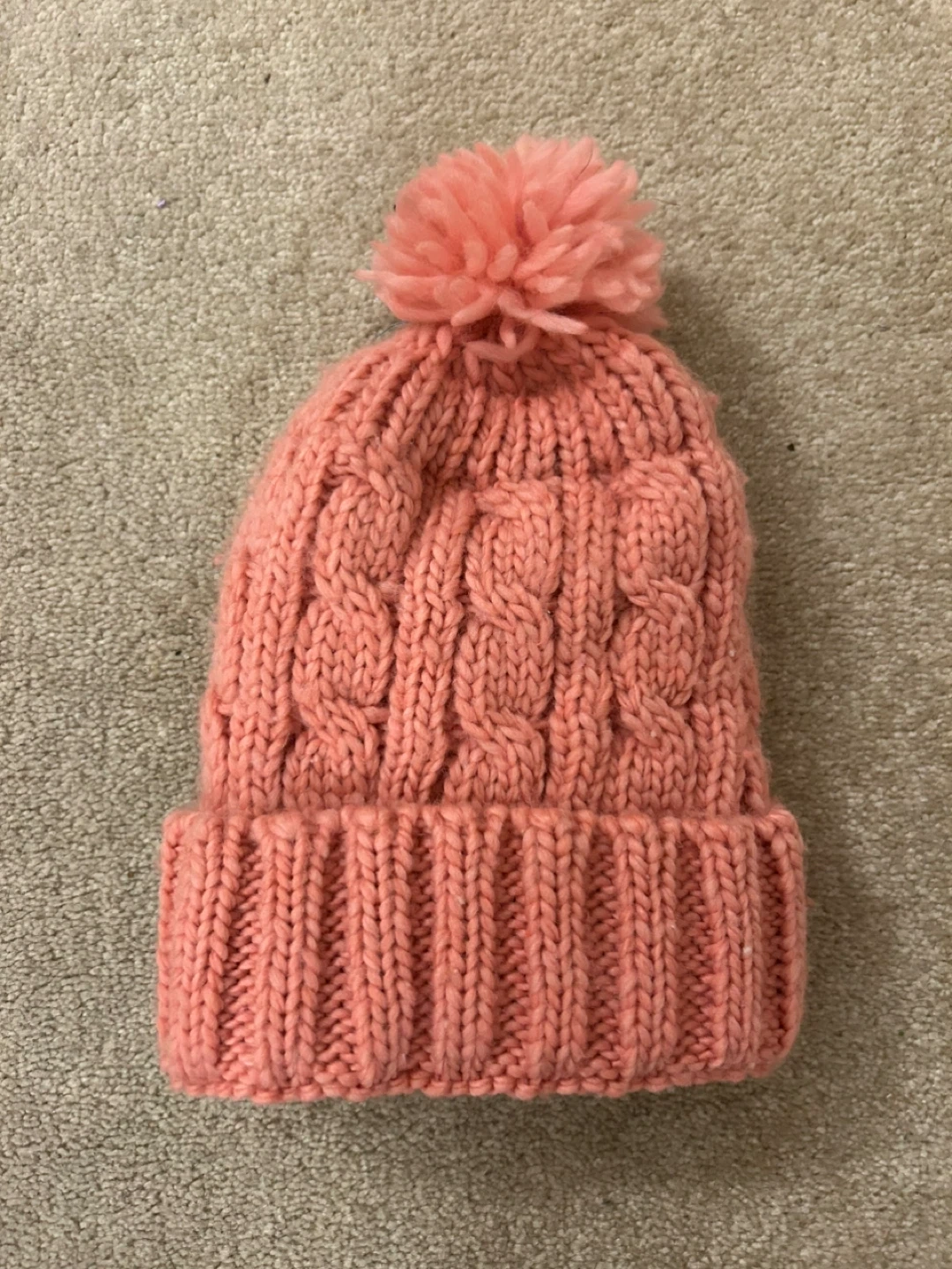 17A cozy pink knit beanie, perfect for keeping warm on chilly days! It features a cute pom pom on top and a classic knit pattern.