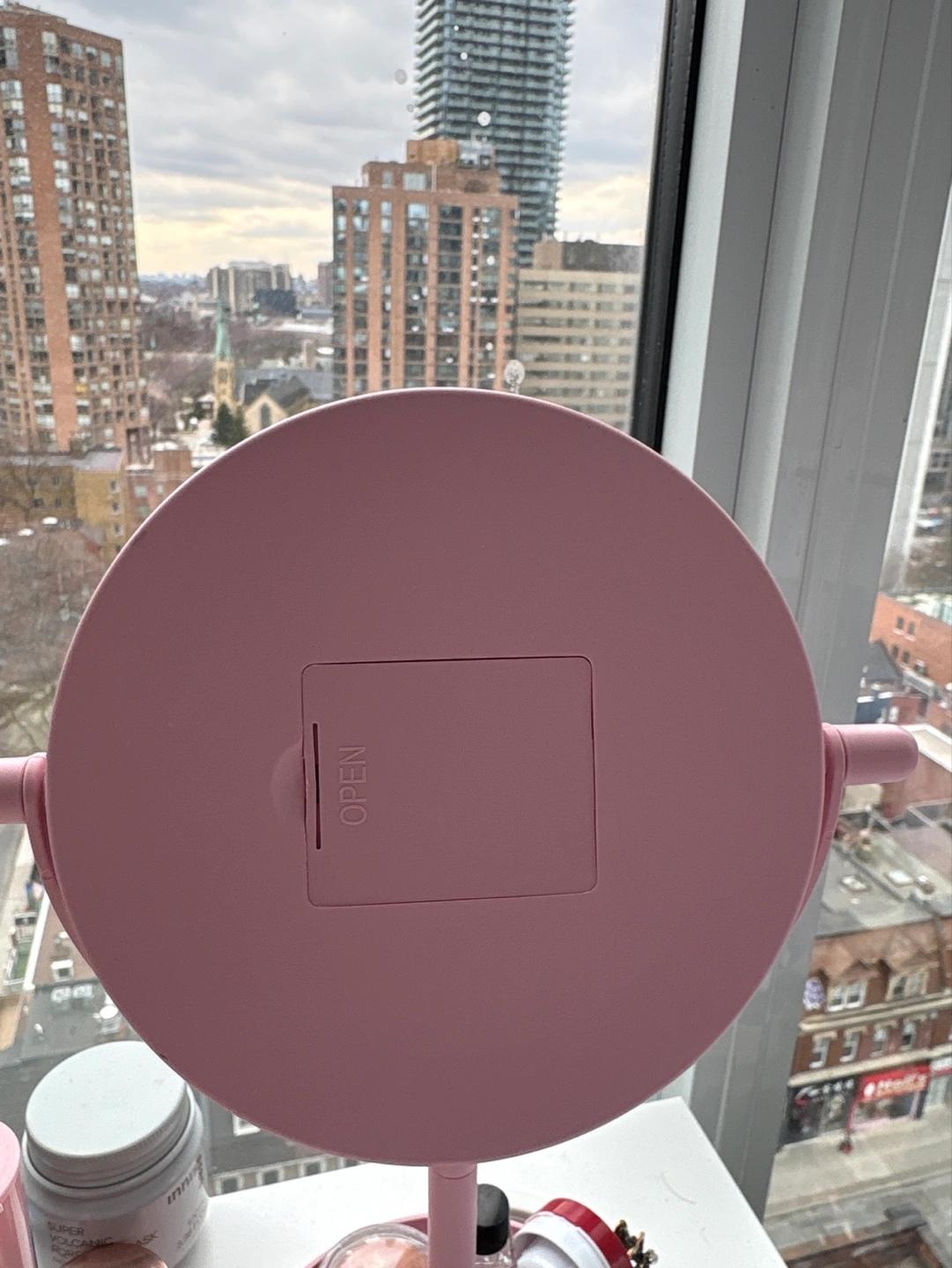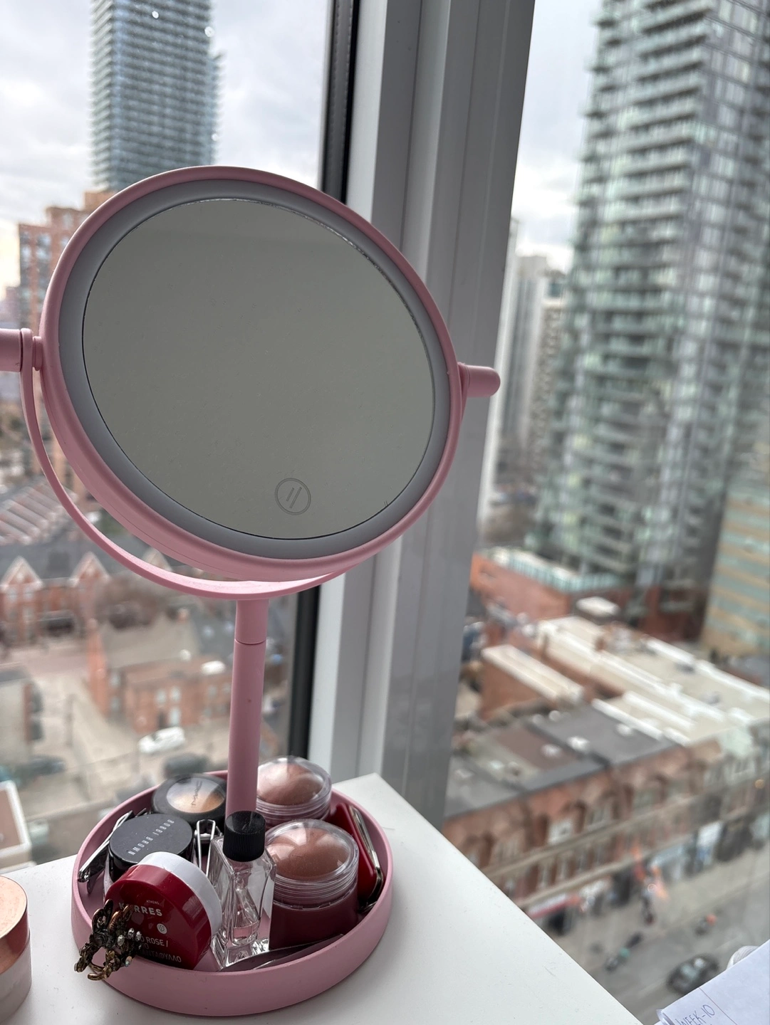168Pink vanity mirror. Features an LED light and a small tray for makeup or jewellery. Adjustable stand. Great for travel or home use.