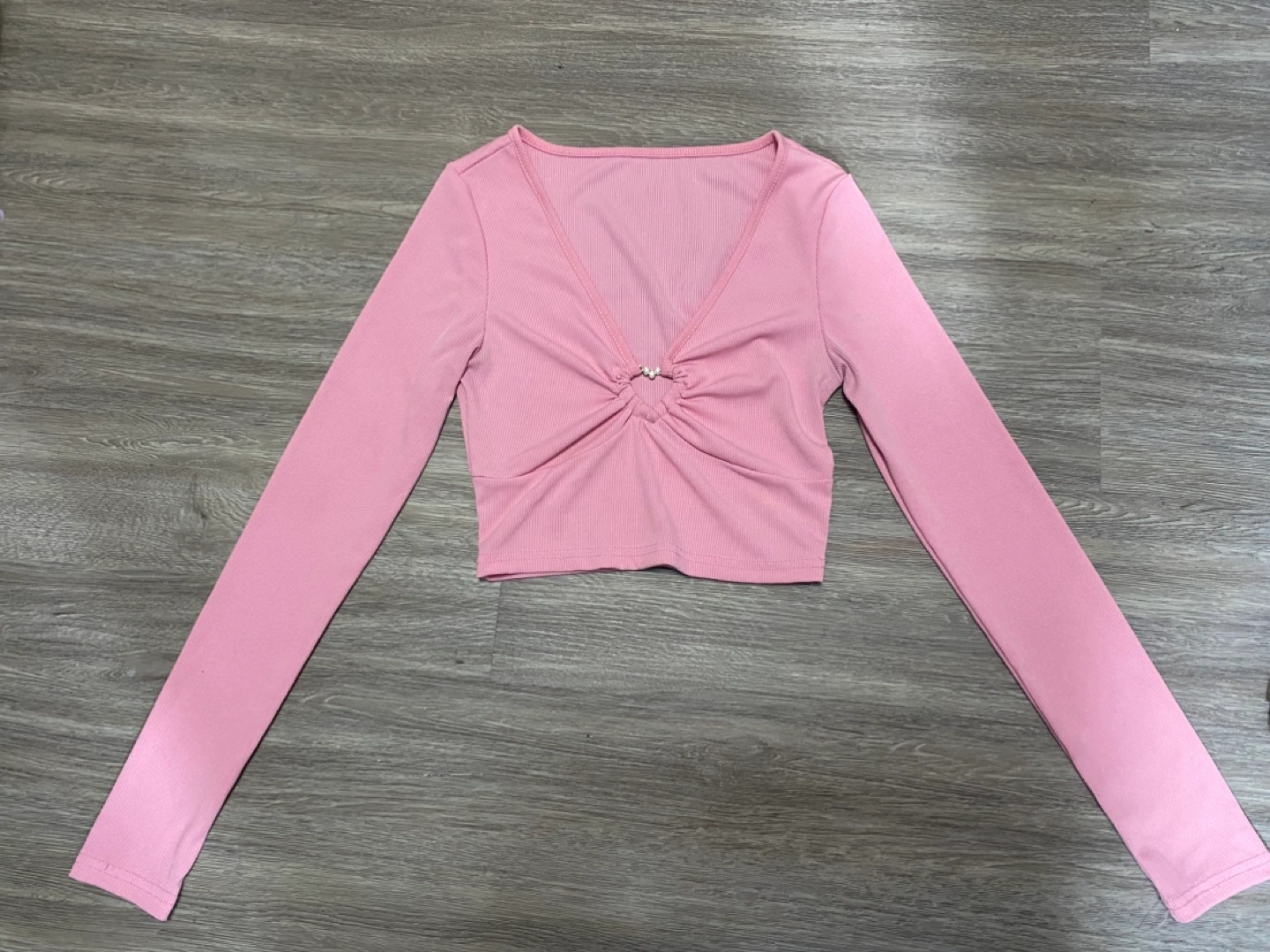 Cute pink ribbed crop top. Long sleeves and a V-neck. Features a small detail at the neckline. Great for layering or wearing alone.