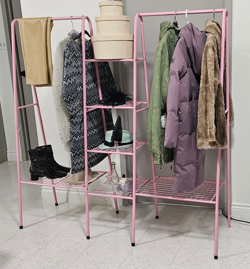Pink metal clothing rack with multiple shelves, perfect for organizing clothes and accessories. Great for small spaces and easy to assemble