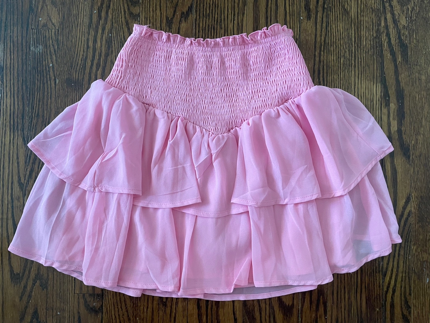 24Adorable pink mini skirt. Features elastic waistband and multiple ruffles. Lightweight and flowy fabric. Perfect for spring and summer.