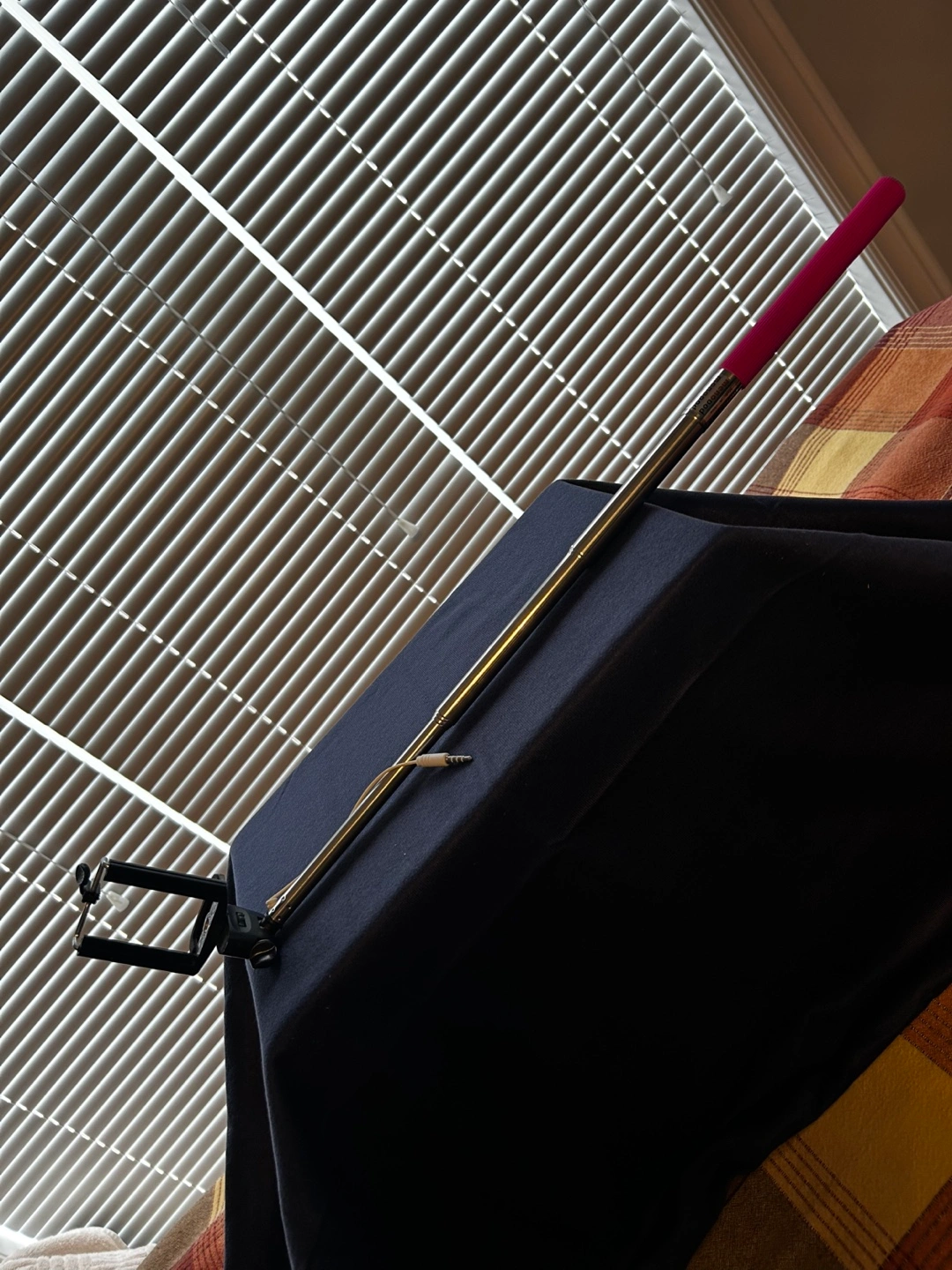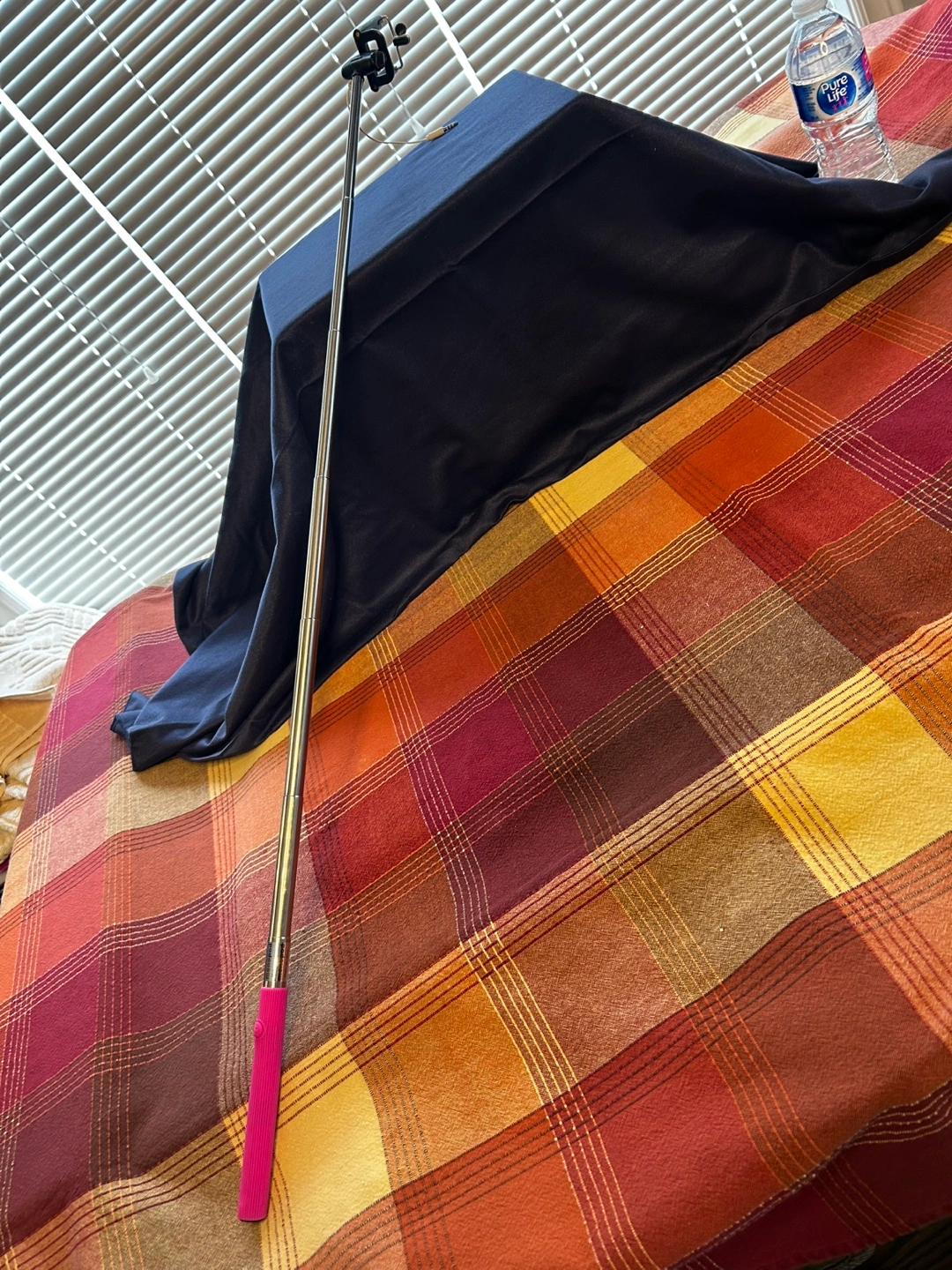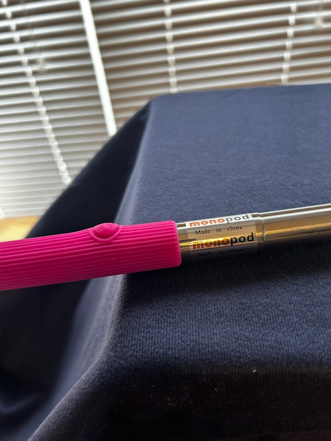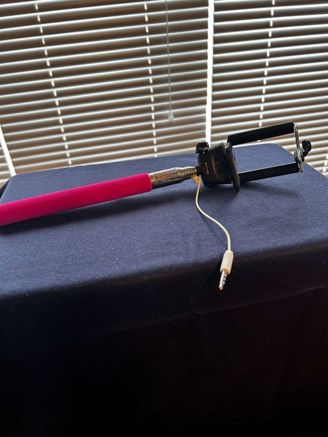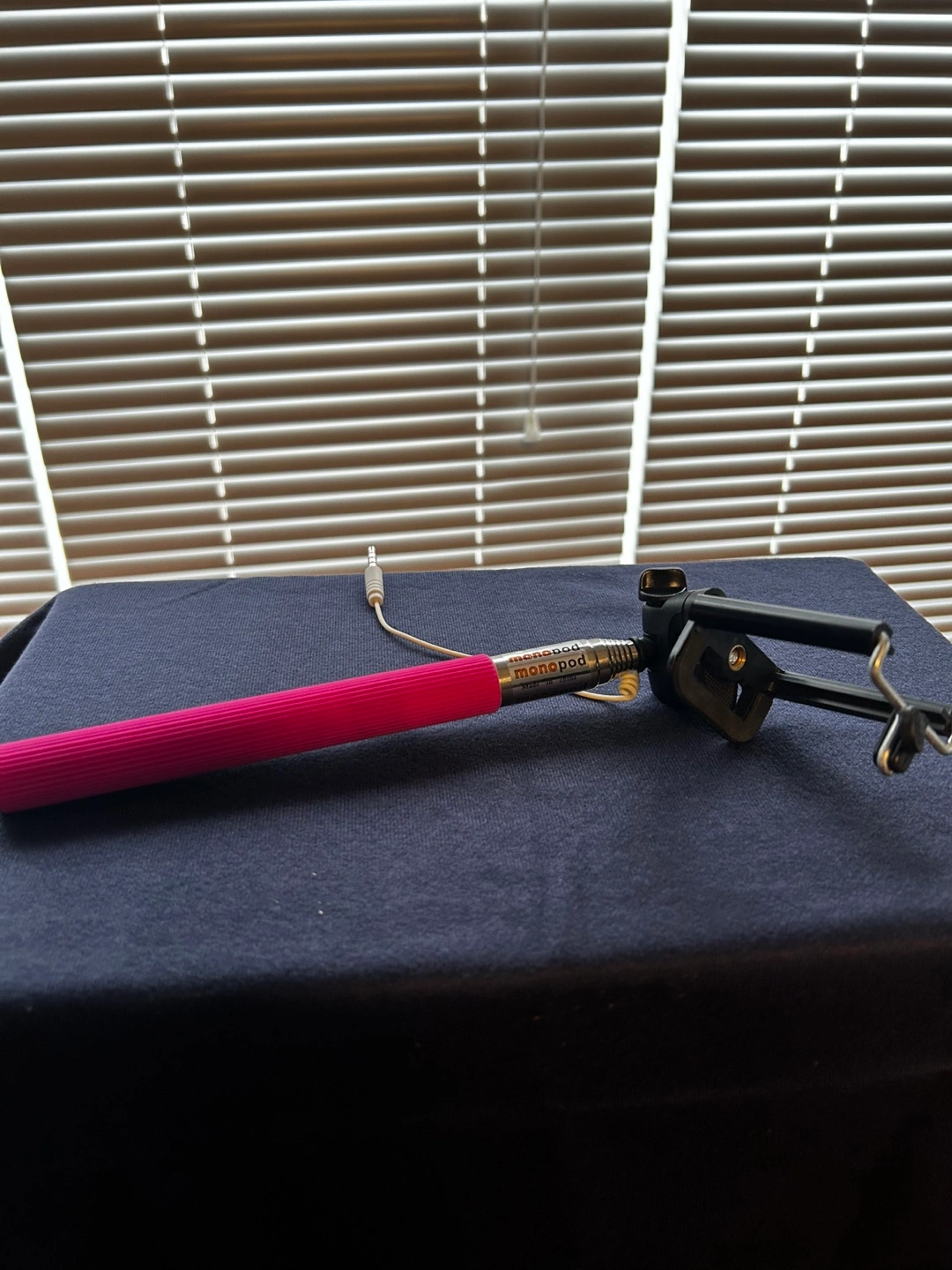 74Extendable selfie stick. Features a pink grip and a black phone mount. Includes wired shutter button. Great for photos and videos.