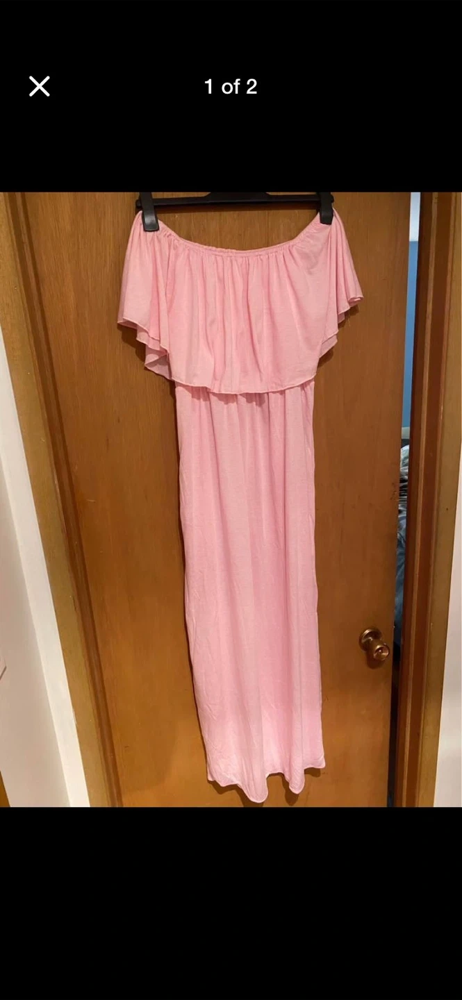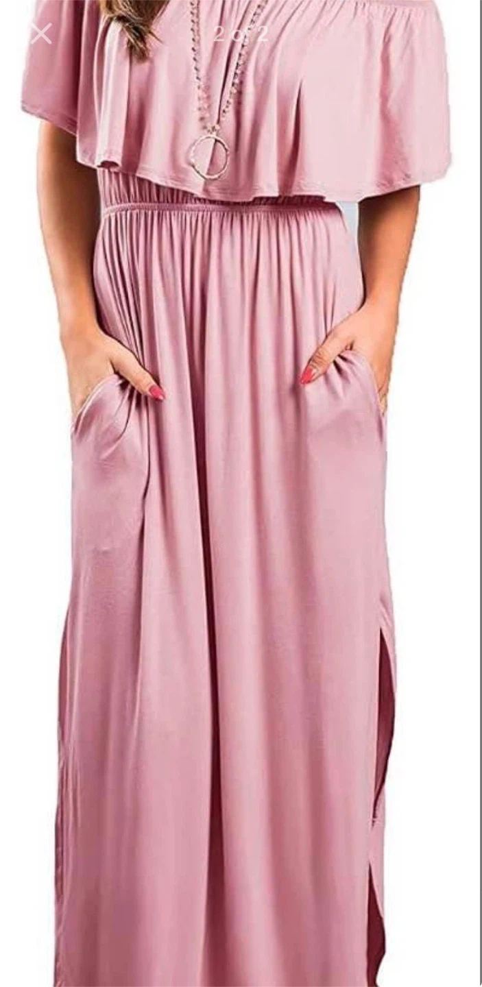 111Cute pink off-shoulder maxi dress with pockets, perfect for summer days! It features a comfortable elastic waist and a flowy skirt. The dress has a relaxed fit and is made of a lightweight material. Never been worn, the dress is a size XL. My partner is usually a M to L and it fit her, it's a very forgiving dress with stretchy material.