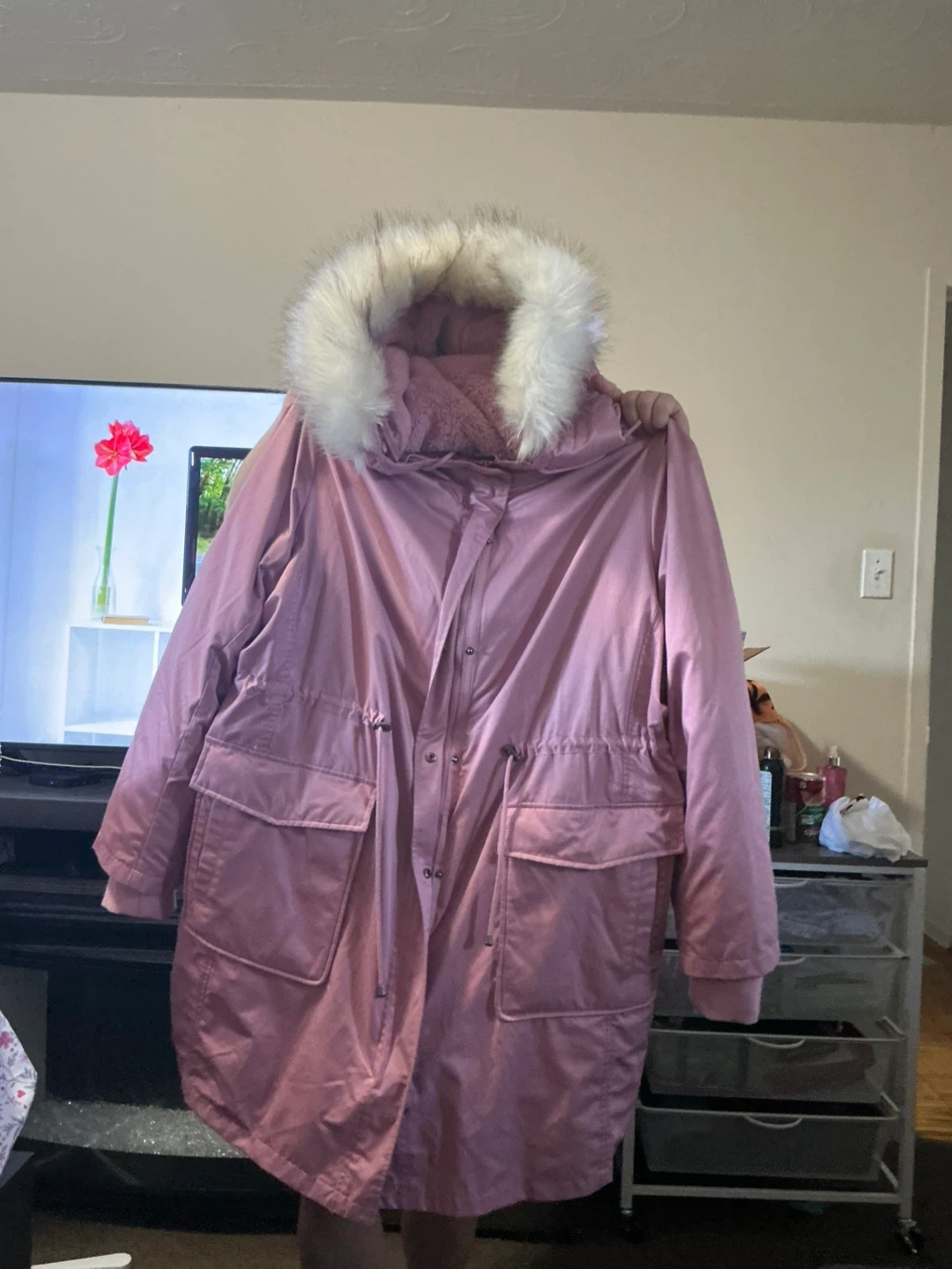 A lovely pink parka coat perfect for cooler weather! It features a faux fur hood for extra warmth and style. It's in great condition and ready for a new home purchased from Torrid asking 65