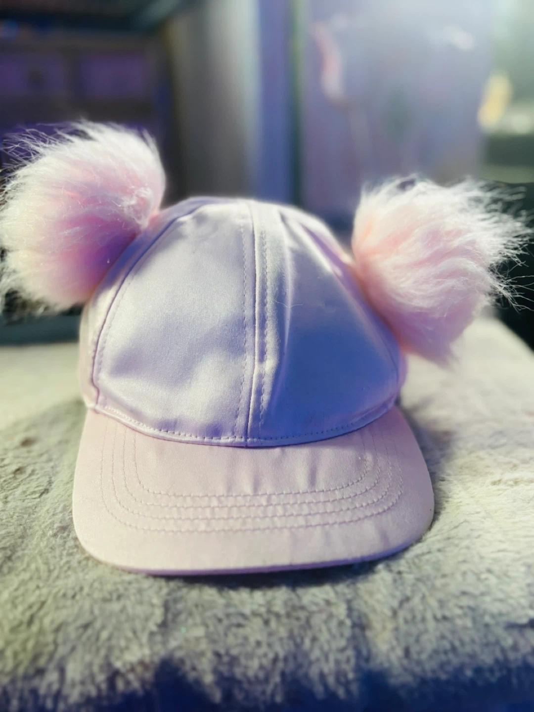 Selling a cute pink hat with pom poms! It's in great condition and would be perfect for keeping warm and stylish. The material is soft and comfortable, making it a fun accessory for any outfit
