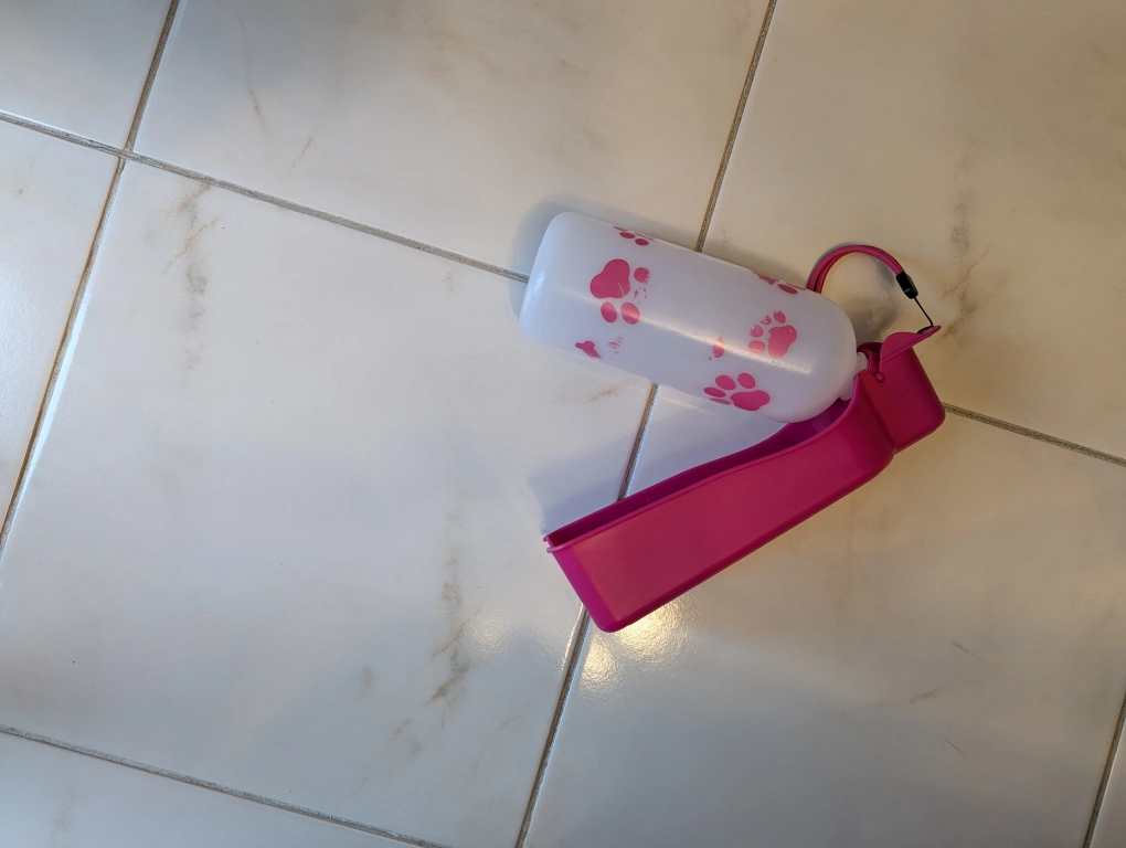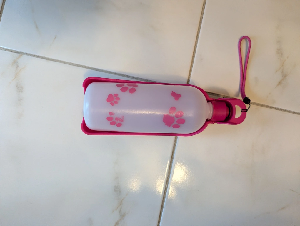 10I'm selling a portable pet water bottle! It's in great shape and perfect for walks or trips with your furry friend. It features a convenient design with a built-in drinking trough, making it easy for your pet to stay hydrated on the go. The bottle is lightweight and easy to carry, with a handy strap. The bottle is white with pink paw prints and a pink trough!