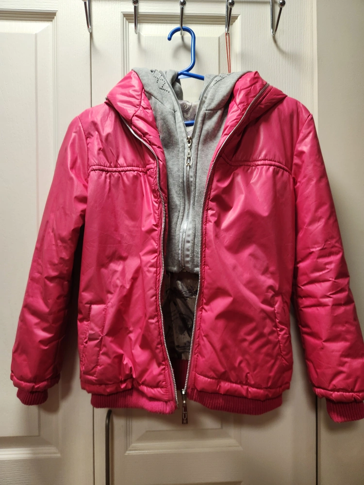 71Selling a cute pink puffer jacket with a grey hood! It's in great condition and perfect for keeping warm on chilly days