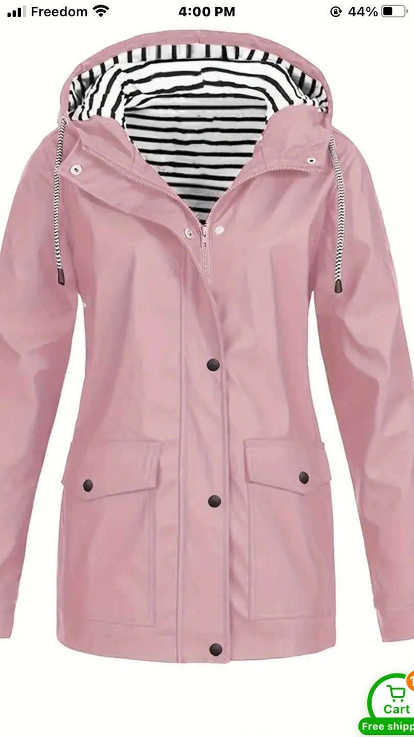 18A cute pink raincoat perfect for those rainy days! It features a striped lining in the hood and a button-up front