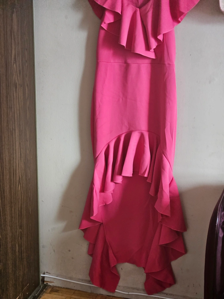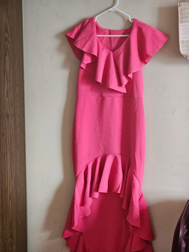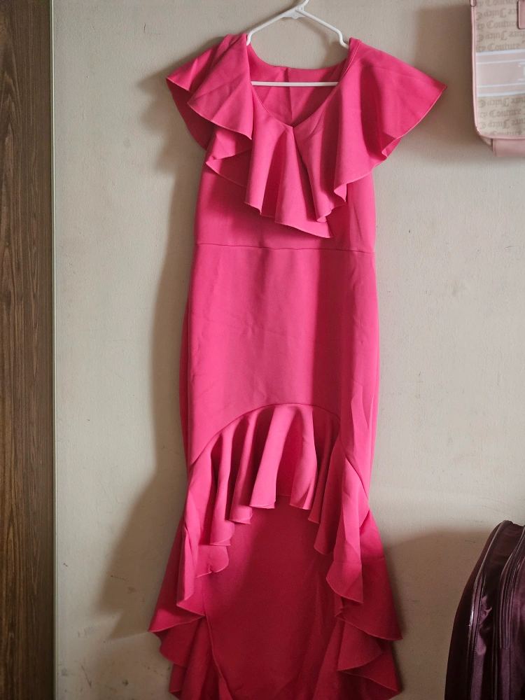 Selling a beautiful pink dress with ruffle detailing! It's perfect for a special occasion or a night out. The dress is in great condition and has a unique, eye-catching design. It features ruffles around the neckline and at the bottom, adding a touch of elegance and flair. It’s a lovely addition to any wardrobe!