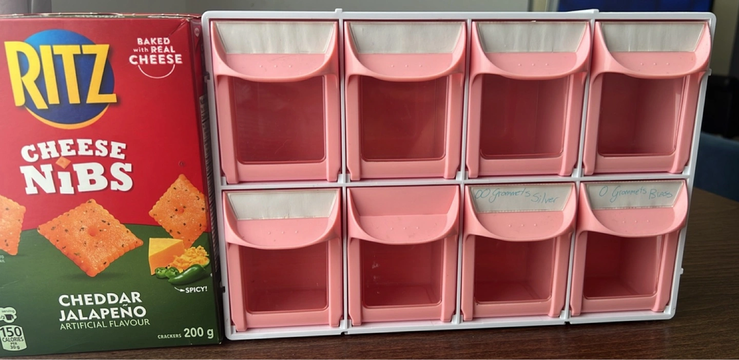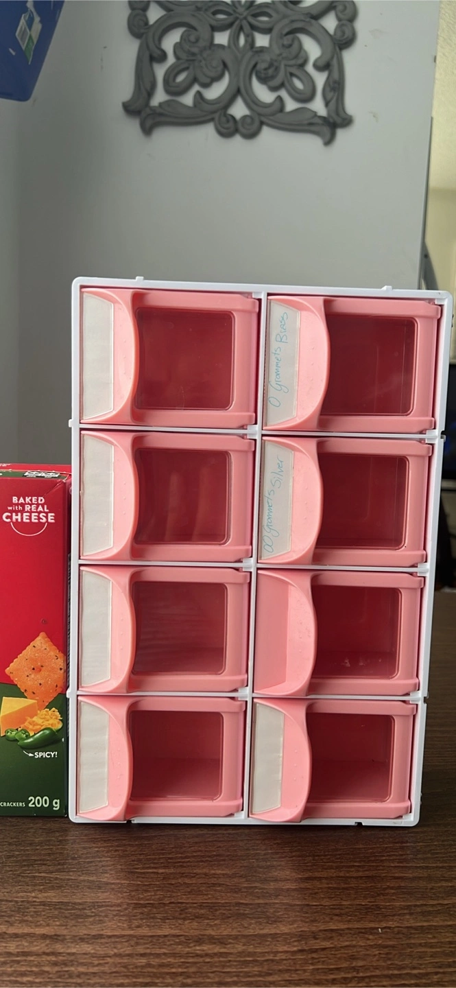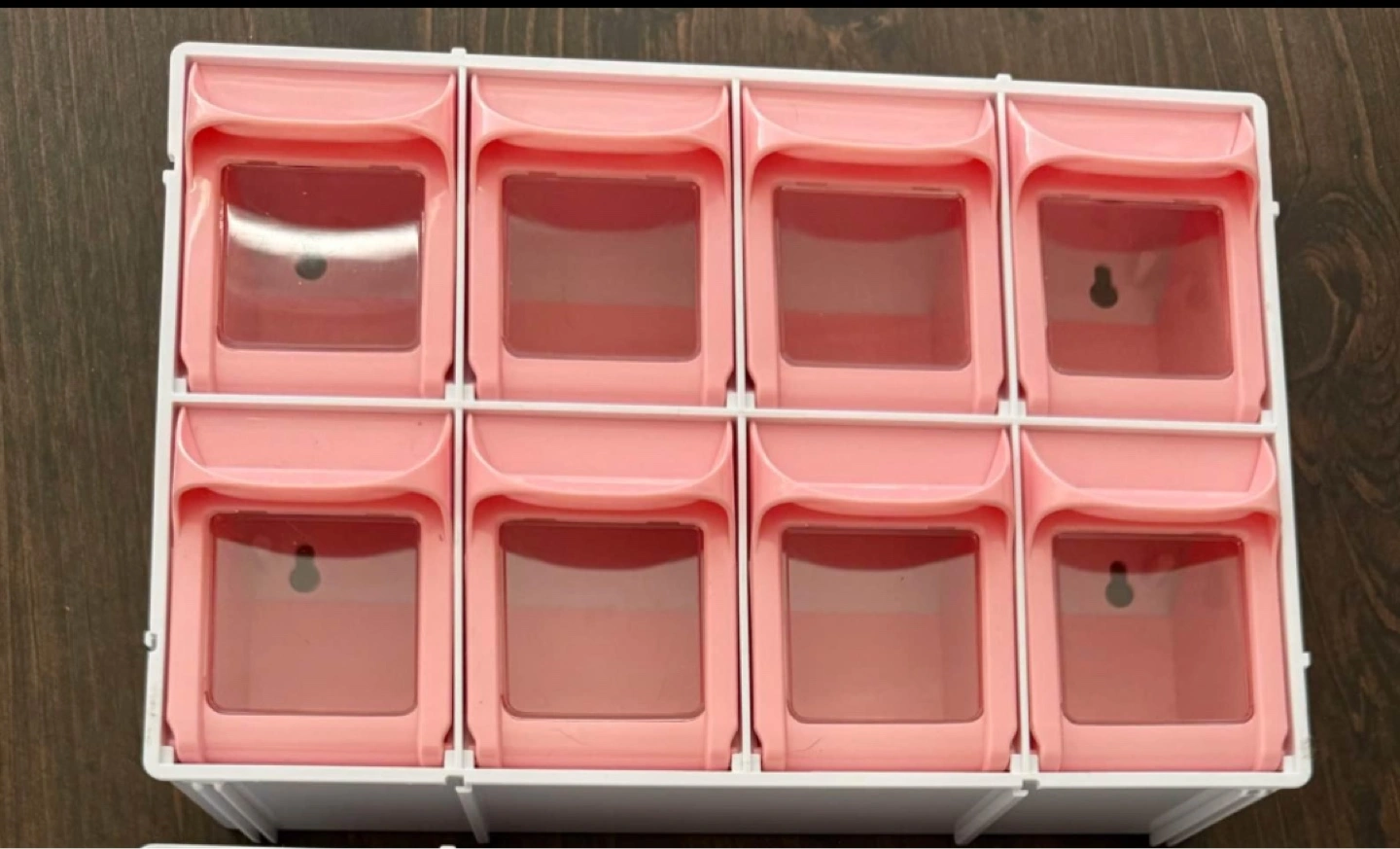 A useful organizer with multiple compartments. Clear compartments with pink trim. Can be mounted to the wall. It’s perfect for a relaxing space.