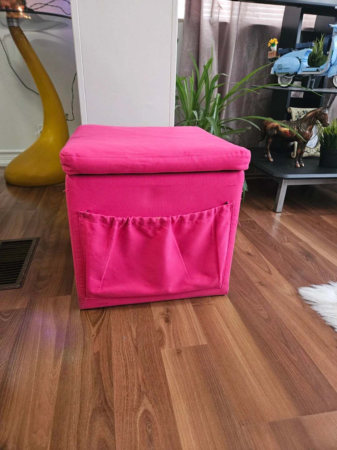 38Selling a cute pink storage ottoman! It's perfect for adding a pop of colour and extra storage to any room. The ottoman has a lift-top lid and handy side pockets for extra organization. Great for storing blankets, toys, or anything else you want to keep out of sight
