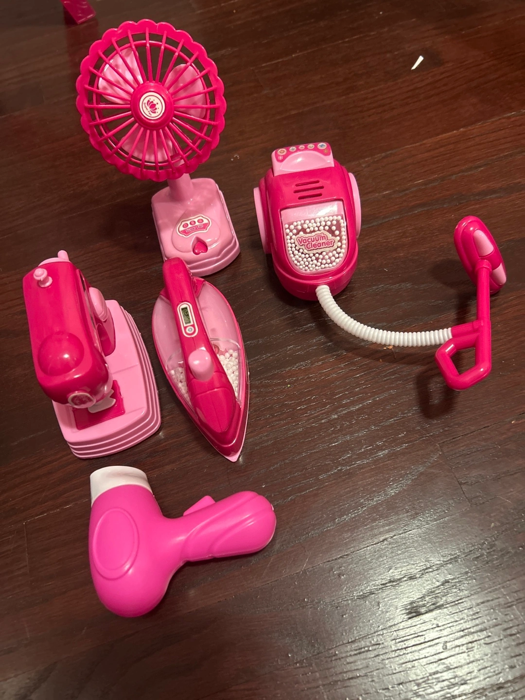 Set of five pink toy appliances: fan, iron, sewing machine, vacuum and hairdryer.