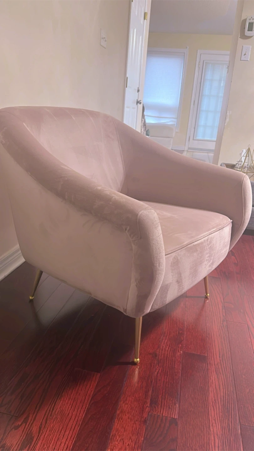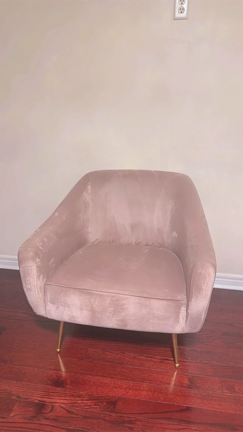 10Selling a lovely pink velvet accent chair! It's in great condition and would be a beautiful addition to any room. The chair features a soft velvet material and stylish gold legs. Perfect for adding a touch of elegance to your space
