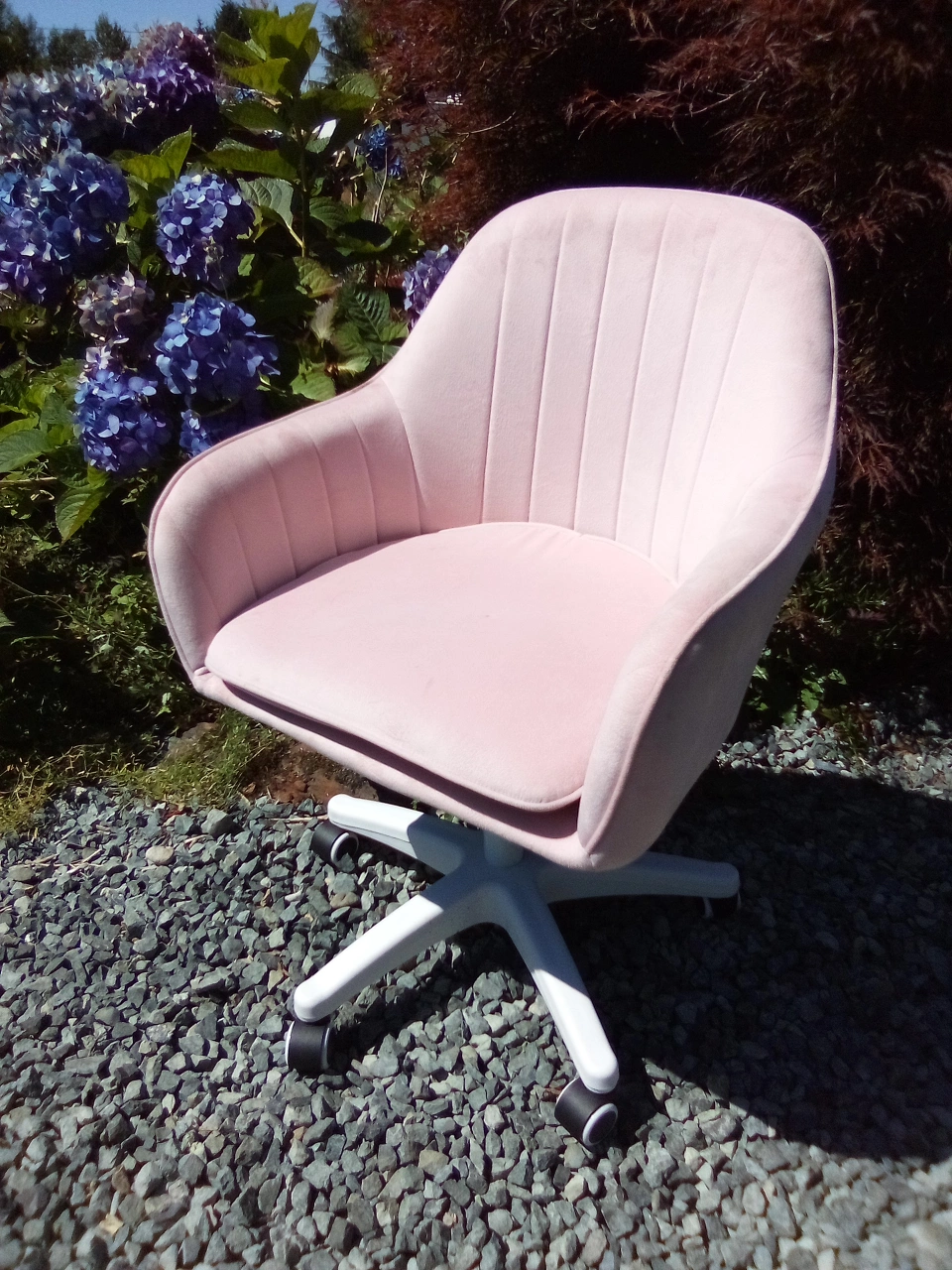 Here's a comfy pink velvet office chair looking for a new home! It's in great condition and would be perfect for a home office or student desk. The chair features a soft velvet fabric and a sturdy base with wheels for easy movement. It's a stylish and functional addition to any workspace