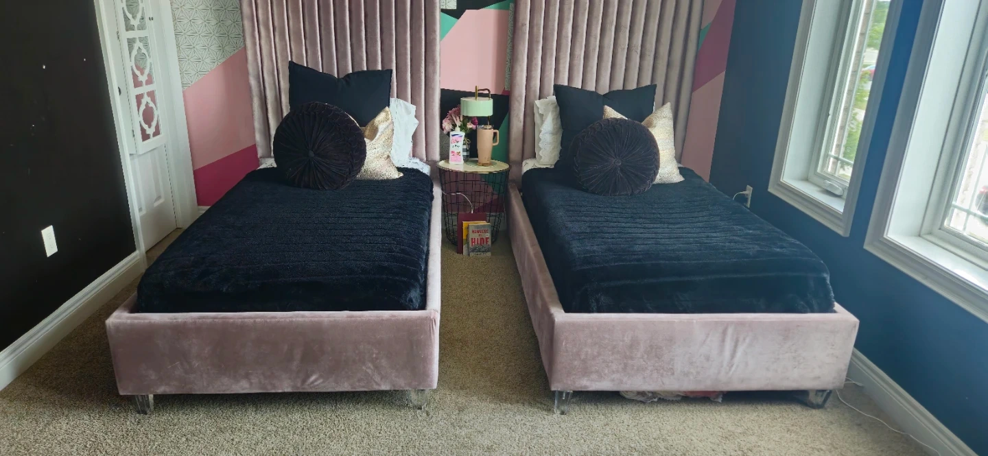 10Selling a lovely pink velvet single bed frame! It's in great condition and would look beautiful in any bedroom. The bed frame has a tall, channel-tufted headboard that adds a touch of elegance. Perfect for a cozy and stylish sleep space. $250 each with matteress included. Pick up only. Serious buyers only.