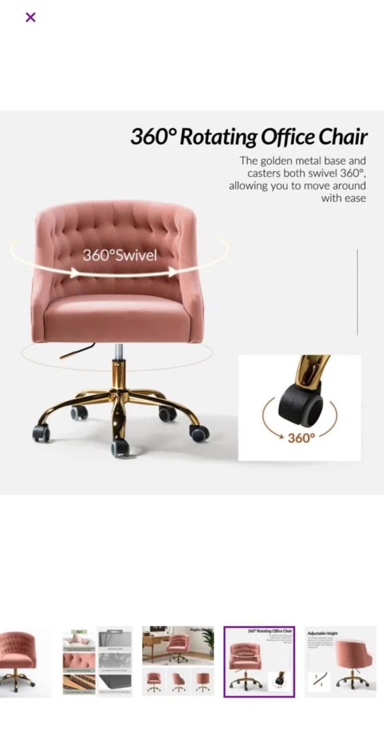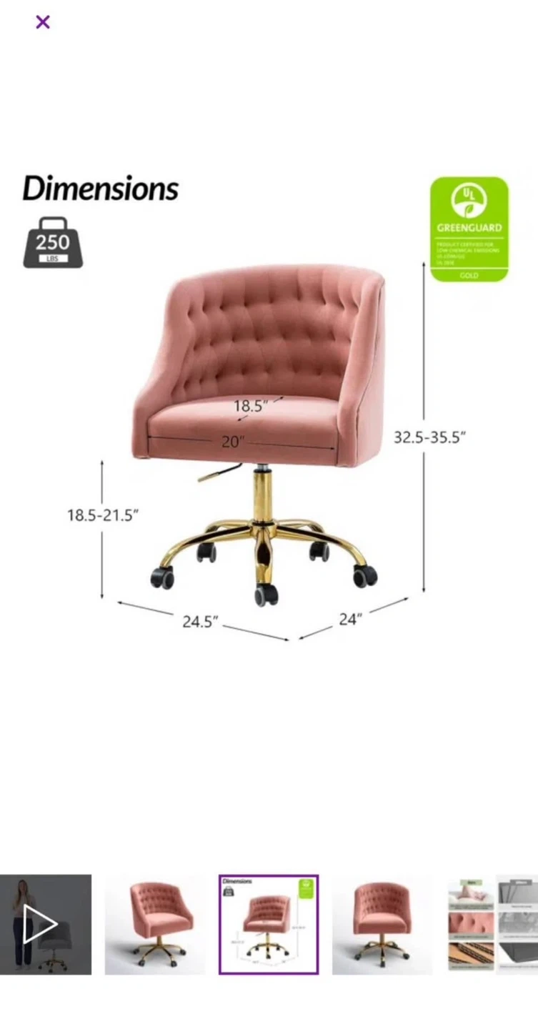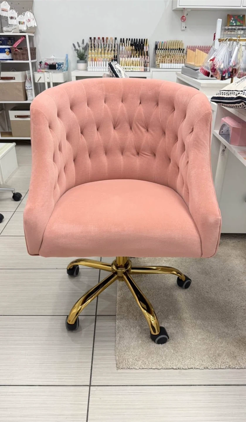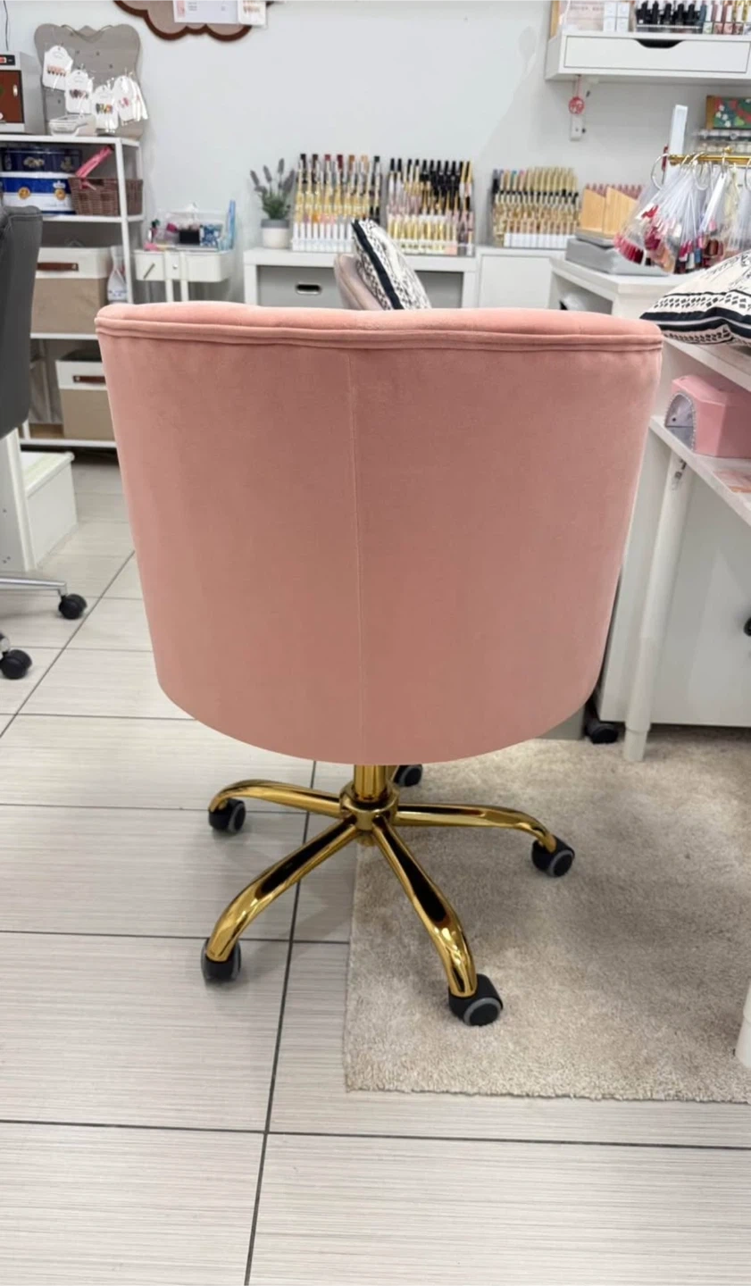 Looking to add a touch of elegance to your workspace? This pink velvet office chair is perfect! It features a swivel base in a beautiful gold finish. The chair is in great condition and ready to elevate your home office setup. The dimensions are: - 18.5" seat depth - 20" seat width - Adjustable height between 32.5"-35.5"