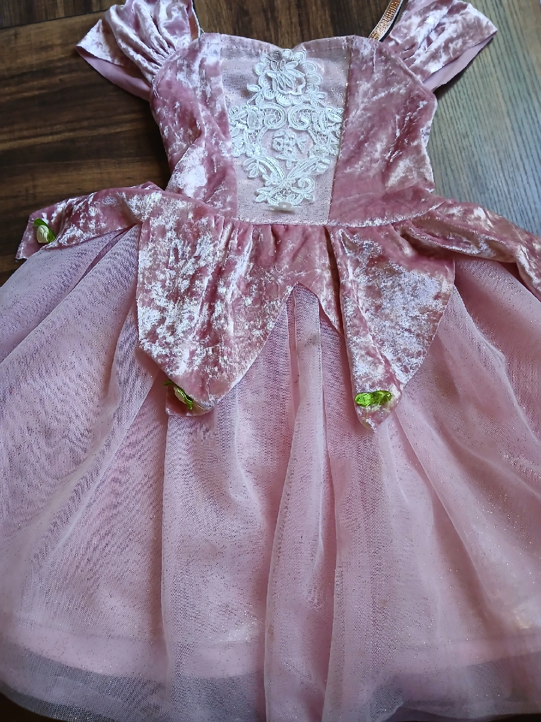 A charming pink dress featuring a velvet bodice with delicate white lace detailing and a layered tulle skirt. Perfect for dress-up or special occasions!