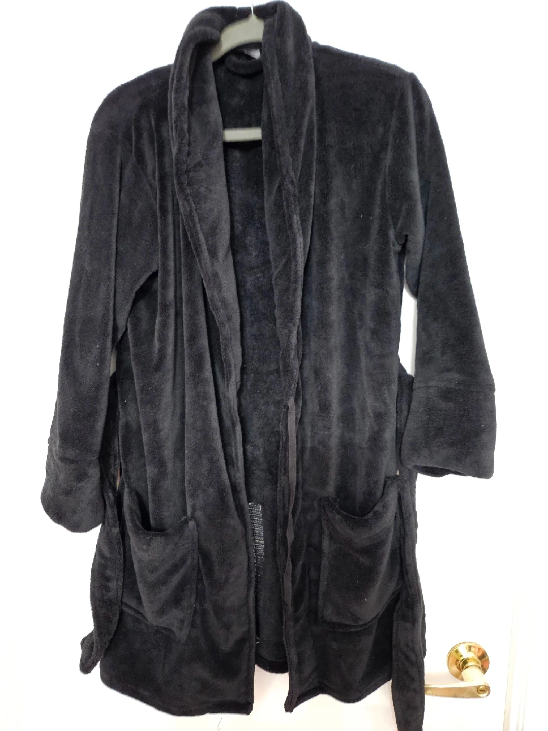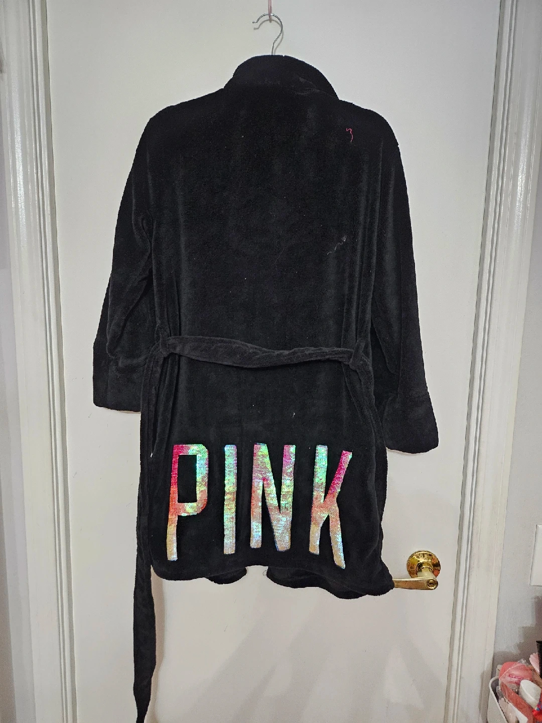 1000+Cozy up with this PINK Victoria's Secret black robe! It's super soft and perfect for lounging around the house. The robe features the PINK logo on the back in a fun, sparkly design