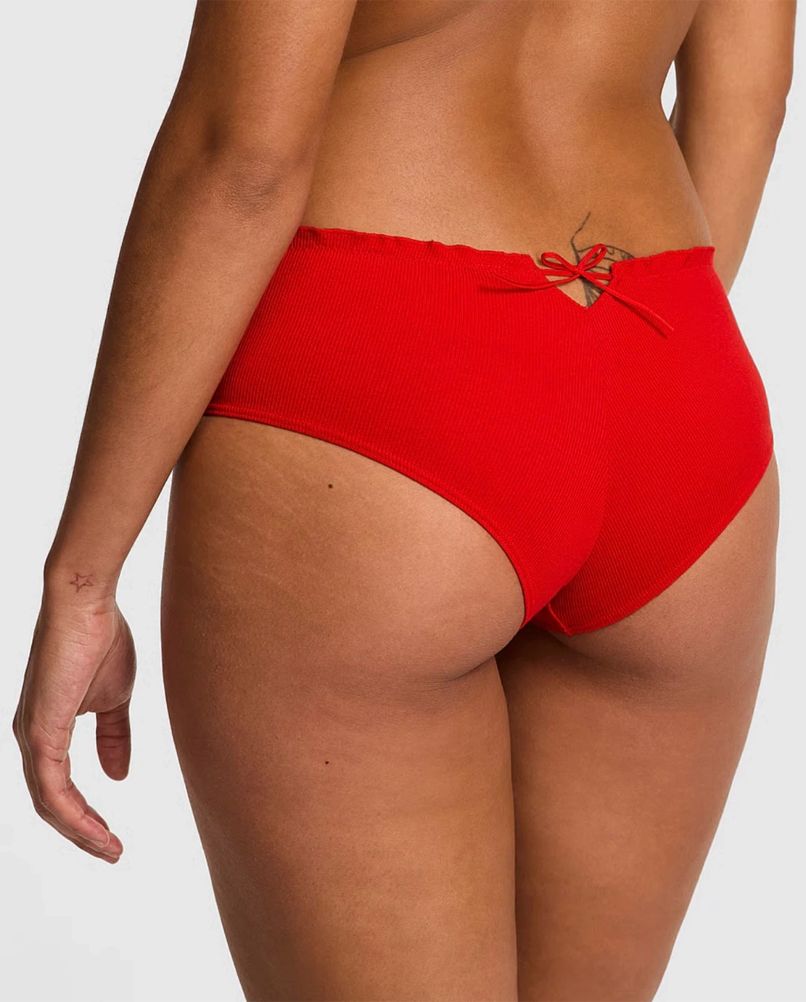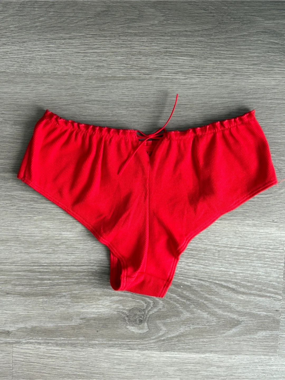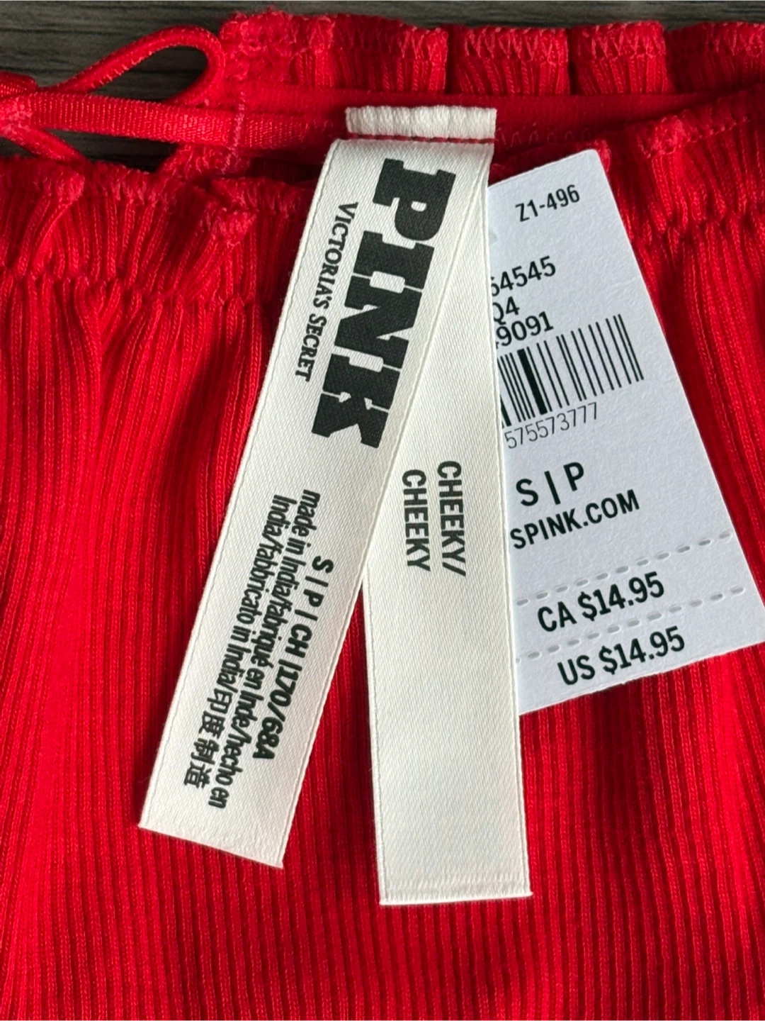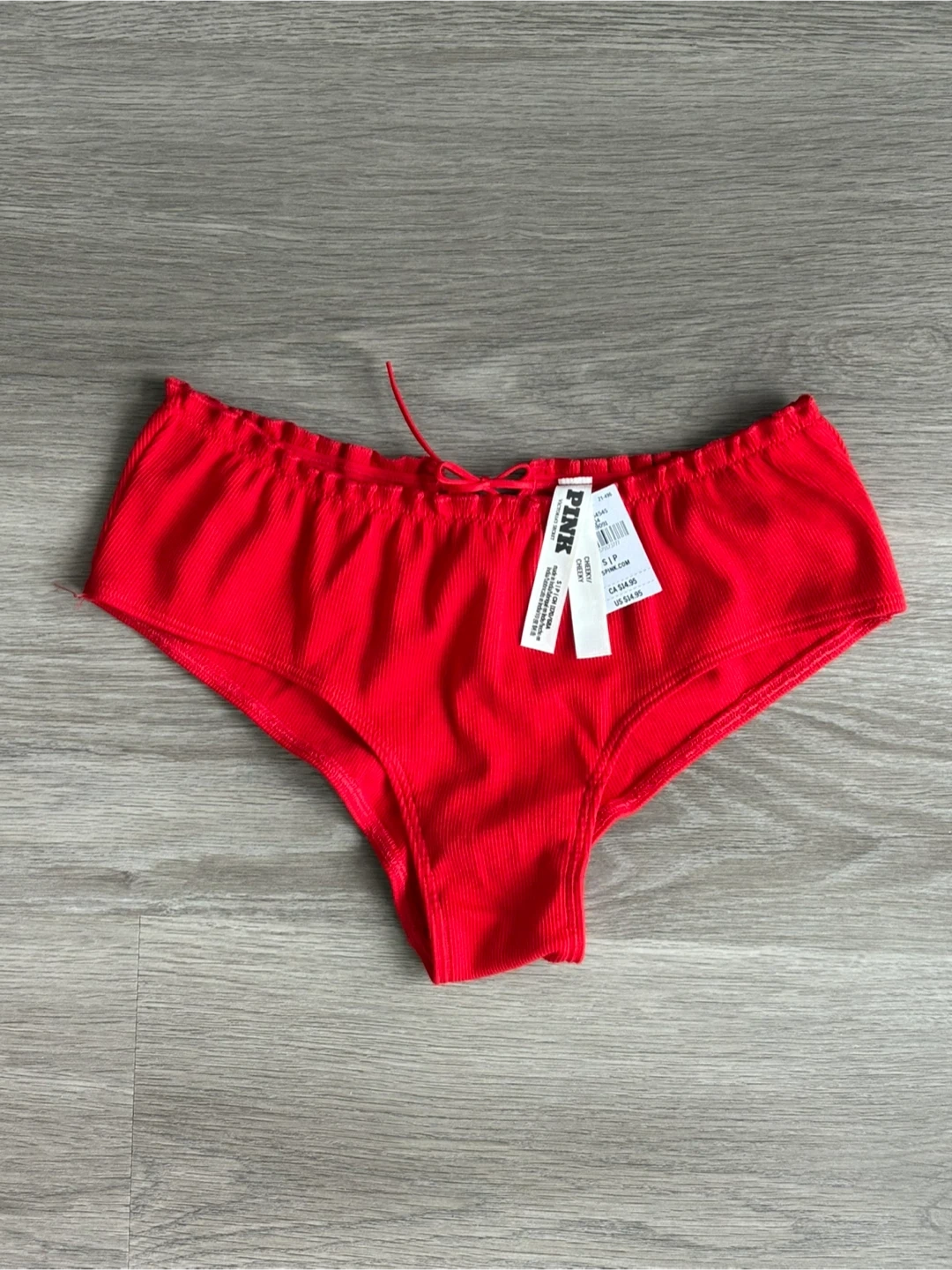 Selling a pair of PINK Victoria's Secret cheeky panties in red! Unused, brand new, still has the tags attached. The original price was CA$14.95 They are honestly so cute but I bought the wrong size by mistake, I'm usually size XS