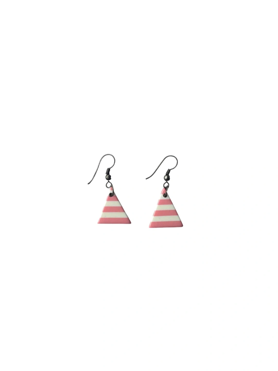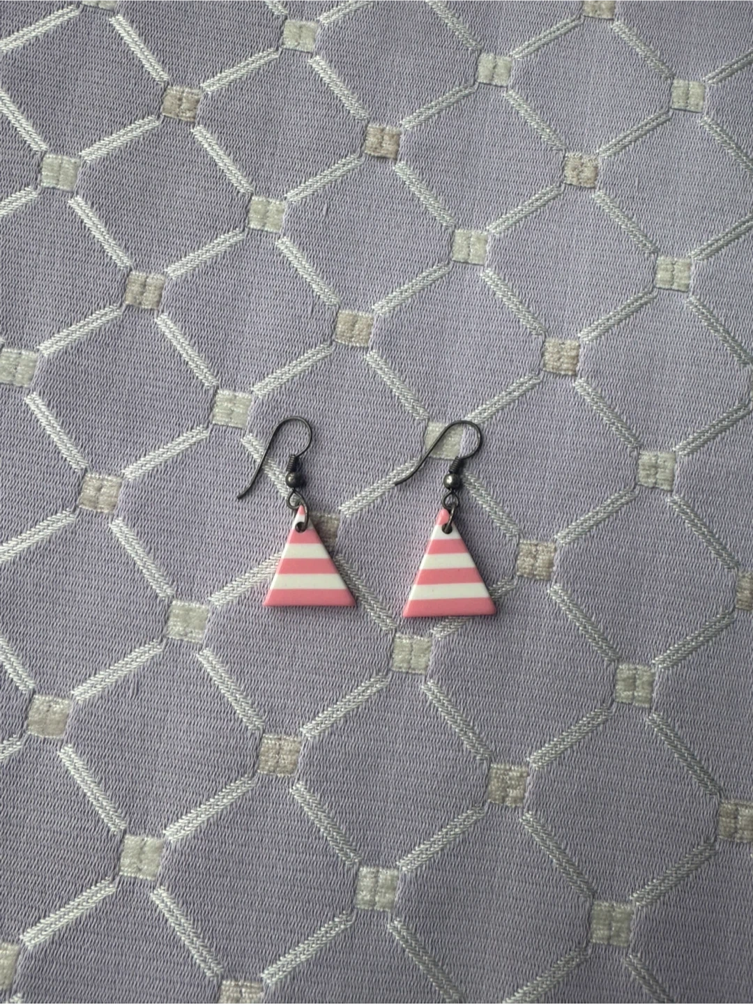 Cute pair of earrings with a triangle shape. They are pink and white striped and have a dark metal hook. Perfect for adding a bit of fun to any outfit!