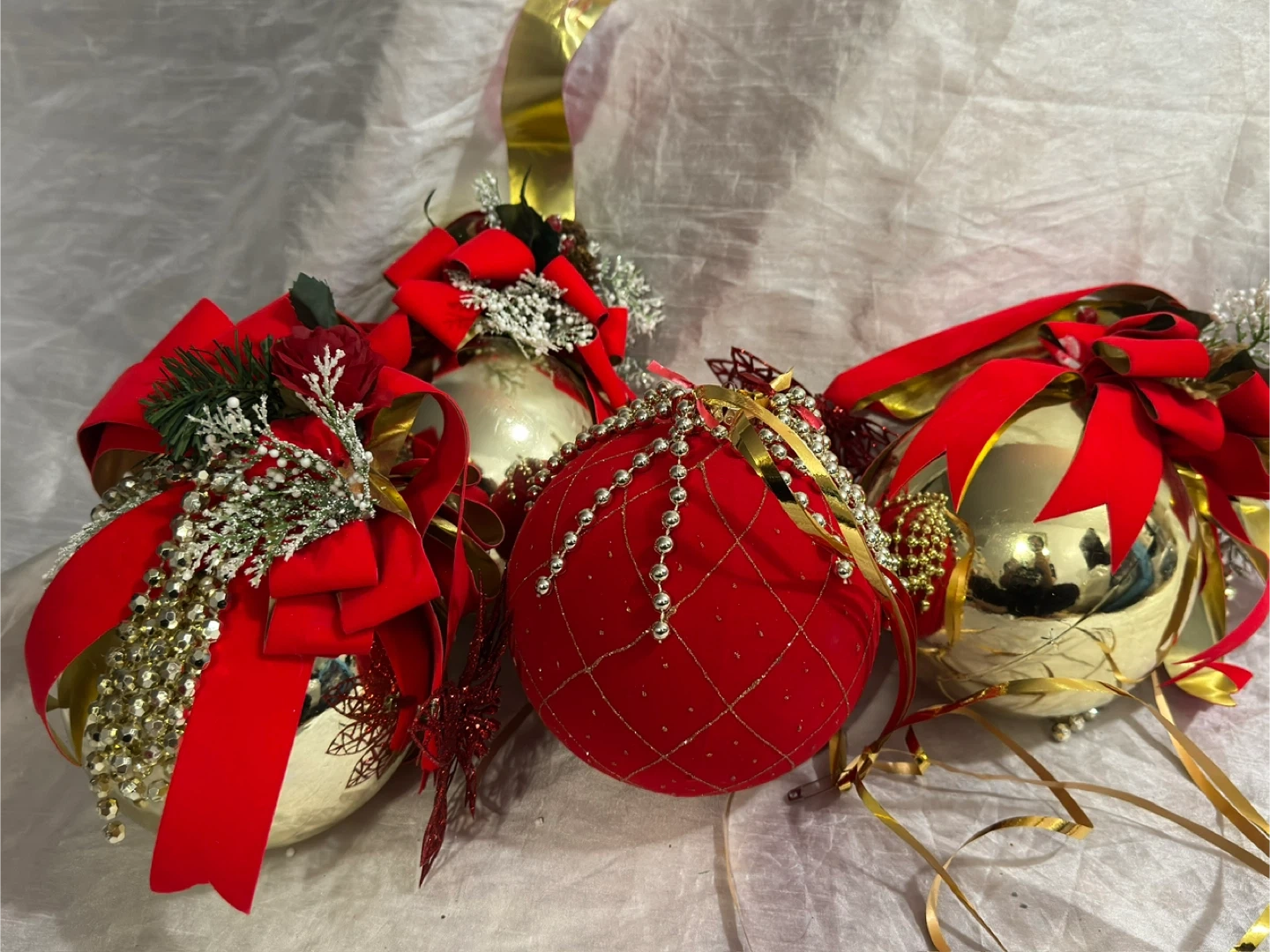 This festive red Christmas ornament features a velvet-like texture with a delicate gold-patterned overlay and beaded accents. It's part of a collection of holiday decorations. It's sure to add a touch of elegance to your tree!