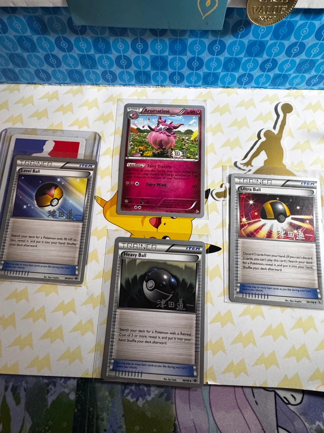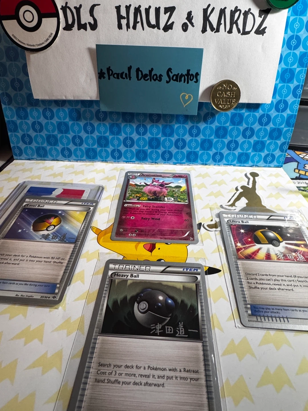 Includes Aromatissee, Heavy Ball, Level Ball, and Ultra Ball trainer and item cards. These Pokemon cards are for collectors and players. They feature distinct artwork and gameplay abilities.