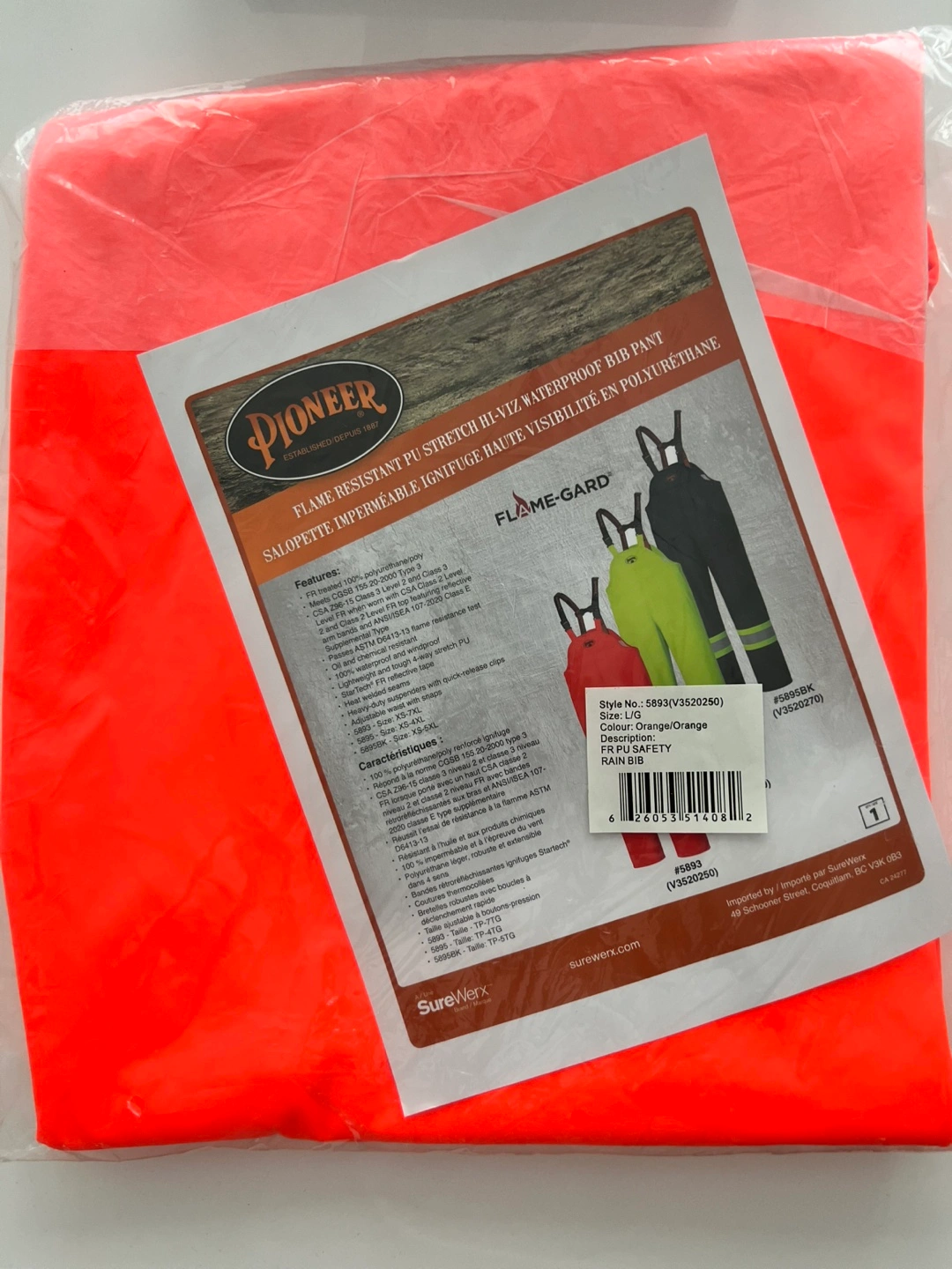Selling a Pioneer flame-resistant, waterproof bib pant in orange, size L/G. It's made of a lightweight and tough 4-way stretch PU material, with StarTech FR reflective tape and heat-welded seams. It also features heavy-duty suspenders with quick-release clips and an adjustable waist with snaps.