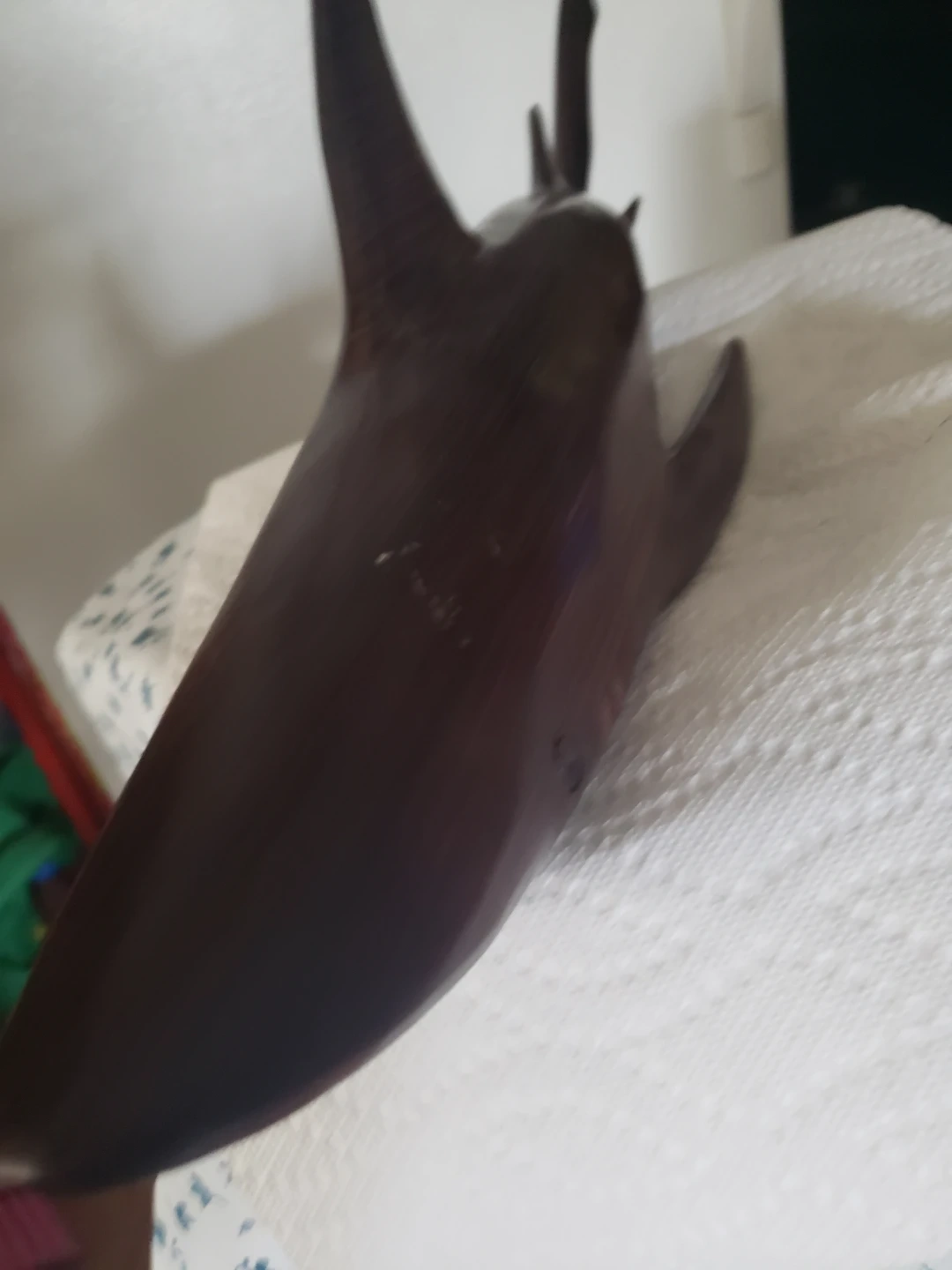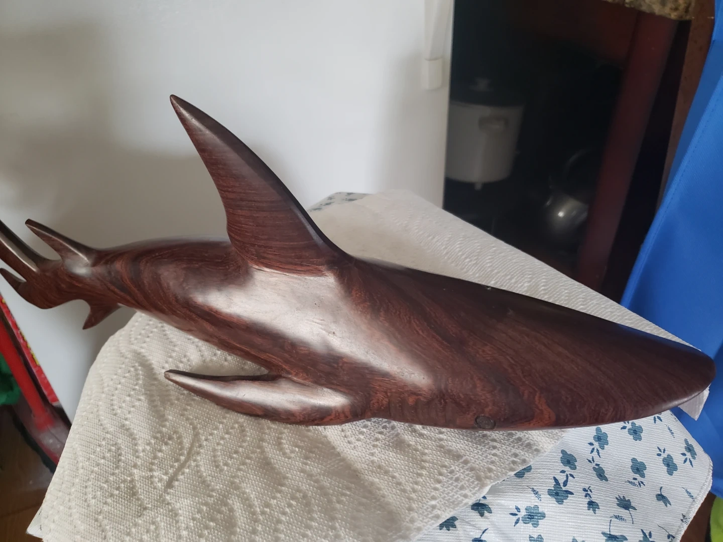 This is a carved wooden shark figurine with a rich, dark wood finish. It measures approximately 21 inches in length. It's a beautiful piece for display.