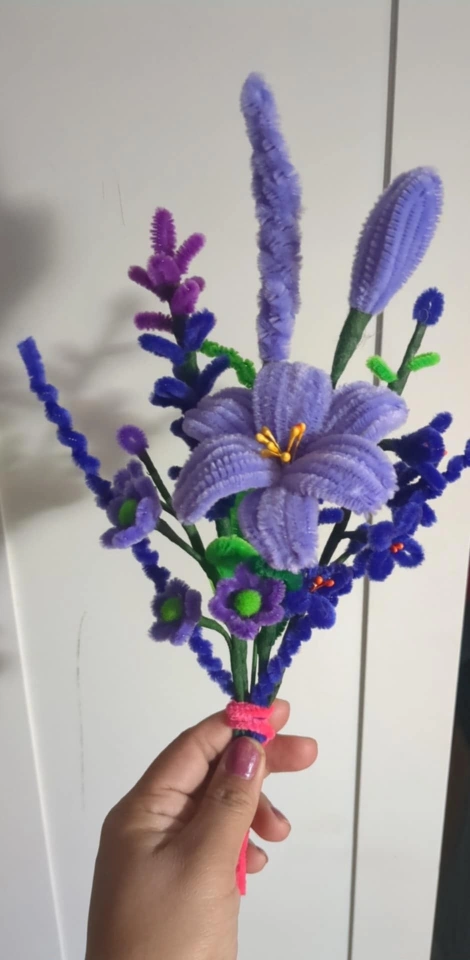 Handmade pipe cleaner flower bouquet. Features purple, blue, and green pipe cleaners. Small and colourful. Ideal for decoration.