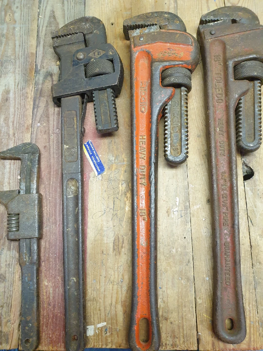 These are various sized Ridgid pipe wrenches. All are used and in fair condition. Great for any plumbing job. Get your hands on this set of reliable tools today! * One 18 inch Ridgid Heavy Duty $25.00 * One 18 inch Toledo Heavy Duty $25.00 * One ETF 18 Heavy Duty $20.00 * One Smaller 9 1/2" Unbranded Adjustable $10.00 Why settle for ordinary when you can wrench with personality? Just a friendly heads-up: if you're seeing this ad, the wrenches are still waiting for a new home. Let's make a deal! No Holds First PU. Union/Weber Waterloo