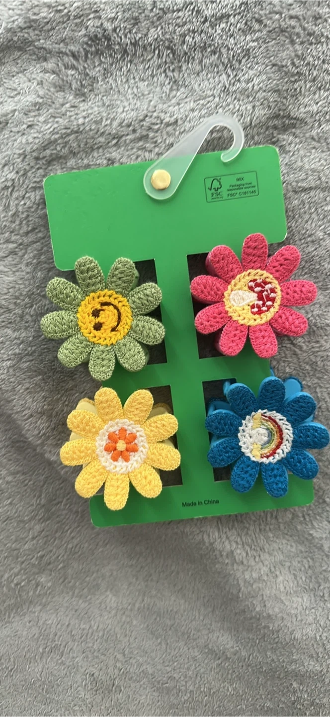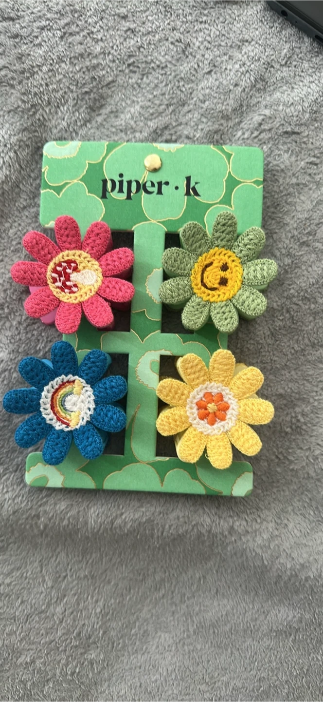 Super cute set of four flower hair clips from Piper.K! These colourful clips feature adorable crocheted flower designs in green, pink, yellow, and blue. They're perfect for adding a touch of fun to any hairstyle