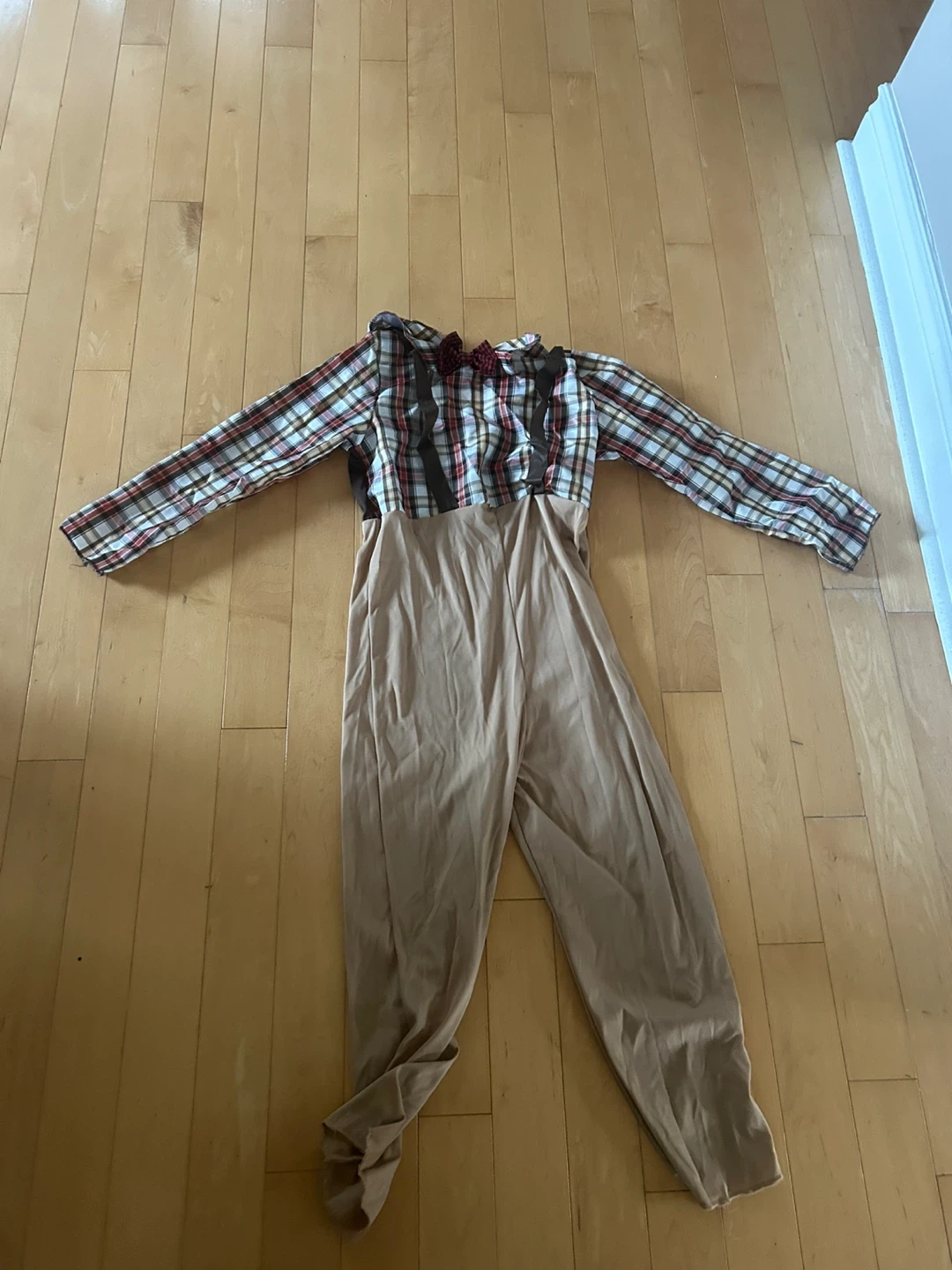 Get ready for Halloween with this fun old man costume! It includes a plaid shirt with attached suspenders and pants, plus a mask with attached hair and beard. The costume is a size medium.