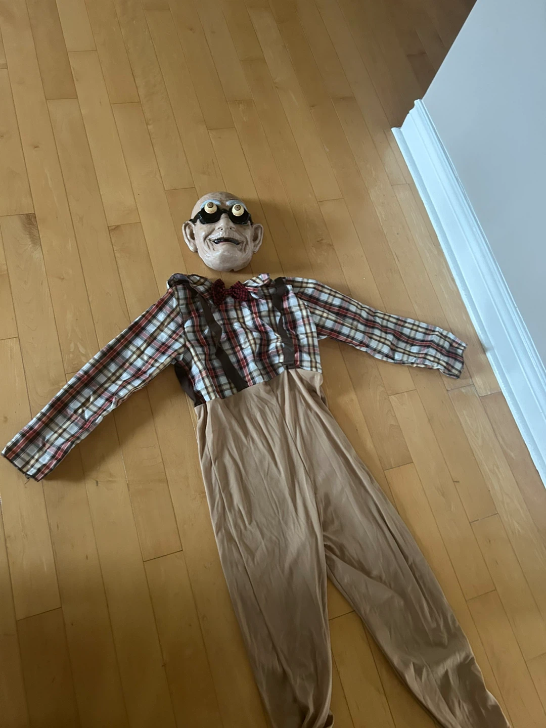 Get ready for Halloween with this fun old man costume! It includes a plaid shirt with attached suspenders and pants, plus a mask with attached hair and beard. The costume is a size medium.