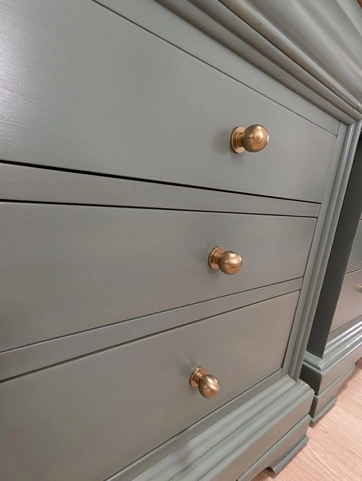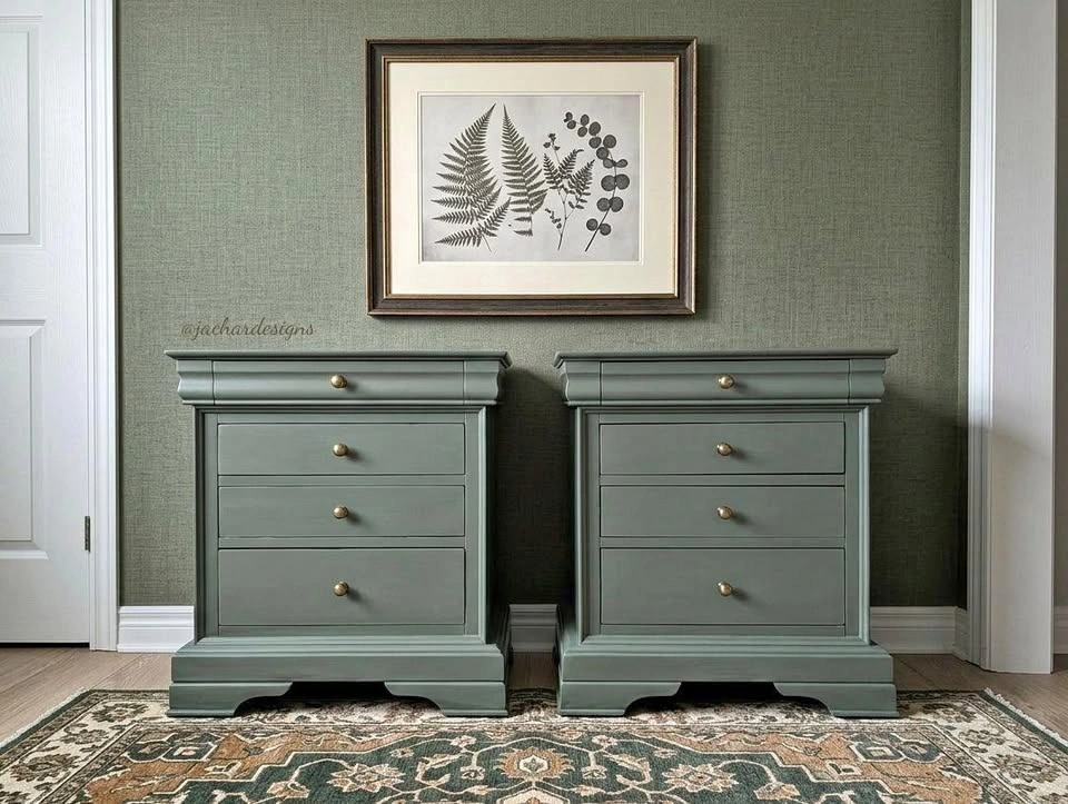 Beautiful oversized wood nightstands professionally refinished in Fusion Minerals 'Carriage House'. Each has four easy-gliding drawers, lined top drawers, and new modern hardware. Finished with an ebony glaze and varathane for dimension and durability.