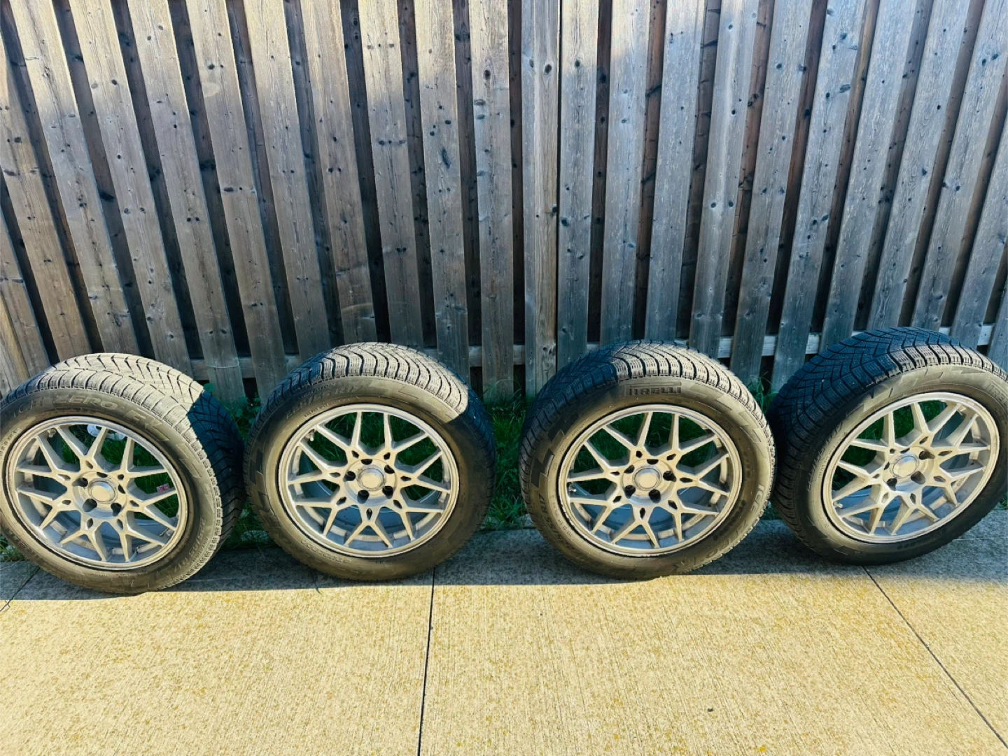 Selling a set of four Pirelli winter tires mounted on rims. The tire size is 225/55R17. They are in good condition and ready to be installed for the winter season 225/55/R17 winter tyres in good condition.pirelli company tyres lot of thread left as you see in the pictures .Bolt pattern 5X114.3 will fit to many cars