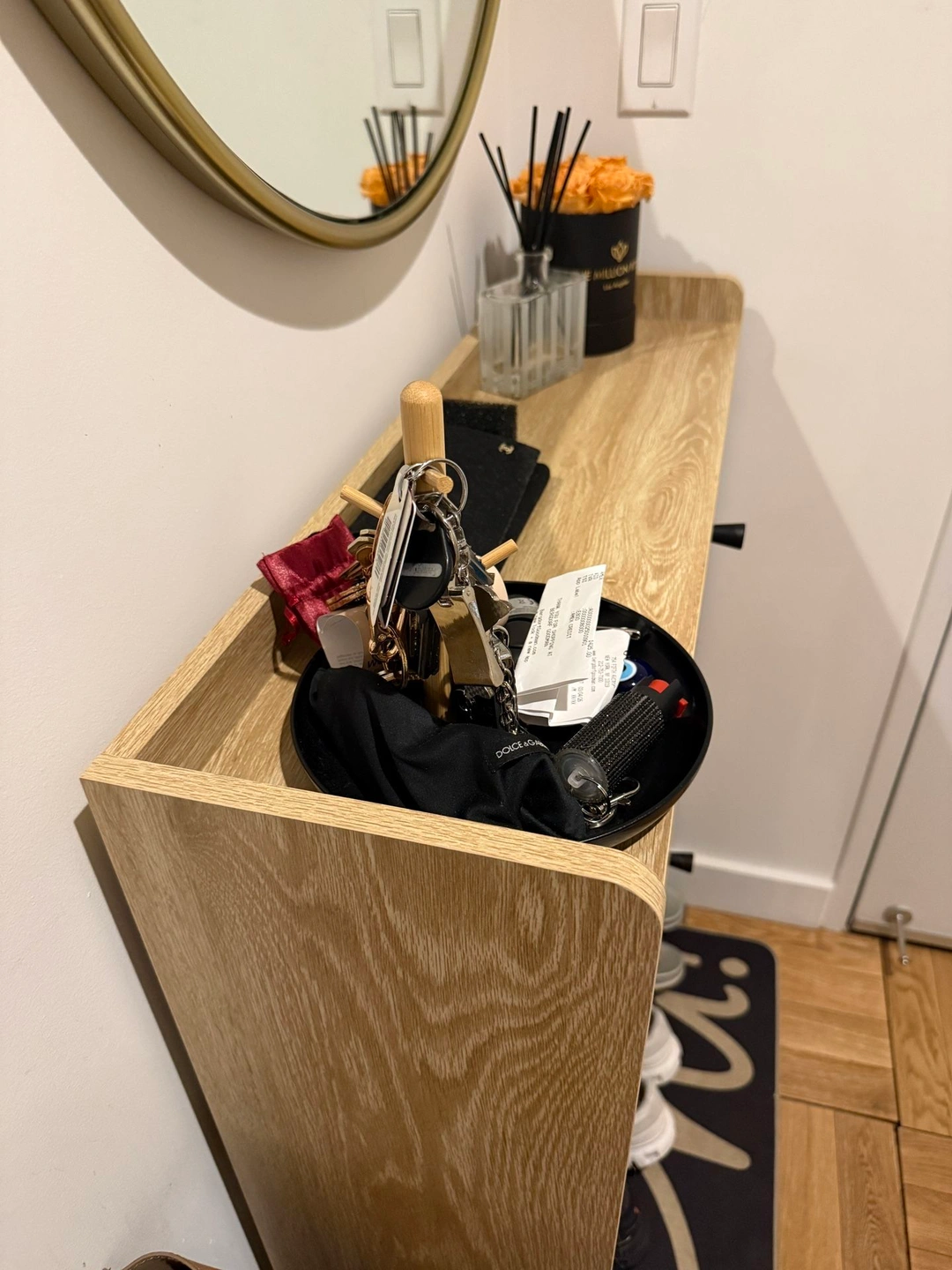 Super modern and sleek shoe cabinet for any entry way. Two shelves for your shoes and other items. 9.25”D x 31.5”W x 39.37”H. Color: Beige. Material: Wood. Item Height: 39-46 in. Item Width: 31-38 in. Brand: Amazon. Item Depth: Less than 12 in.
