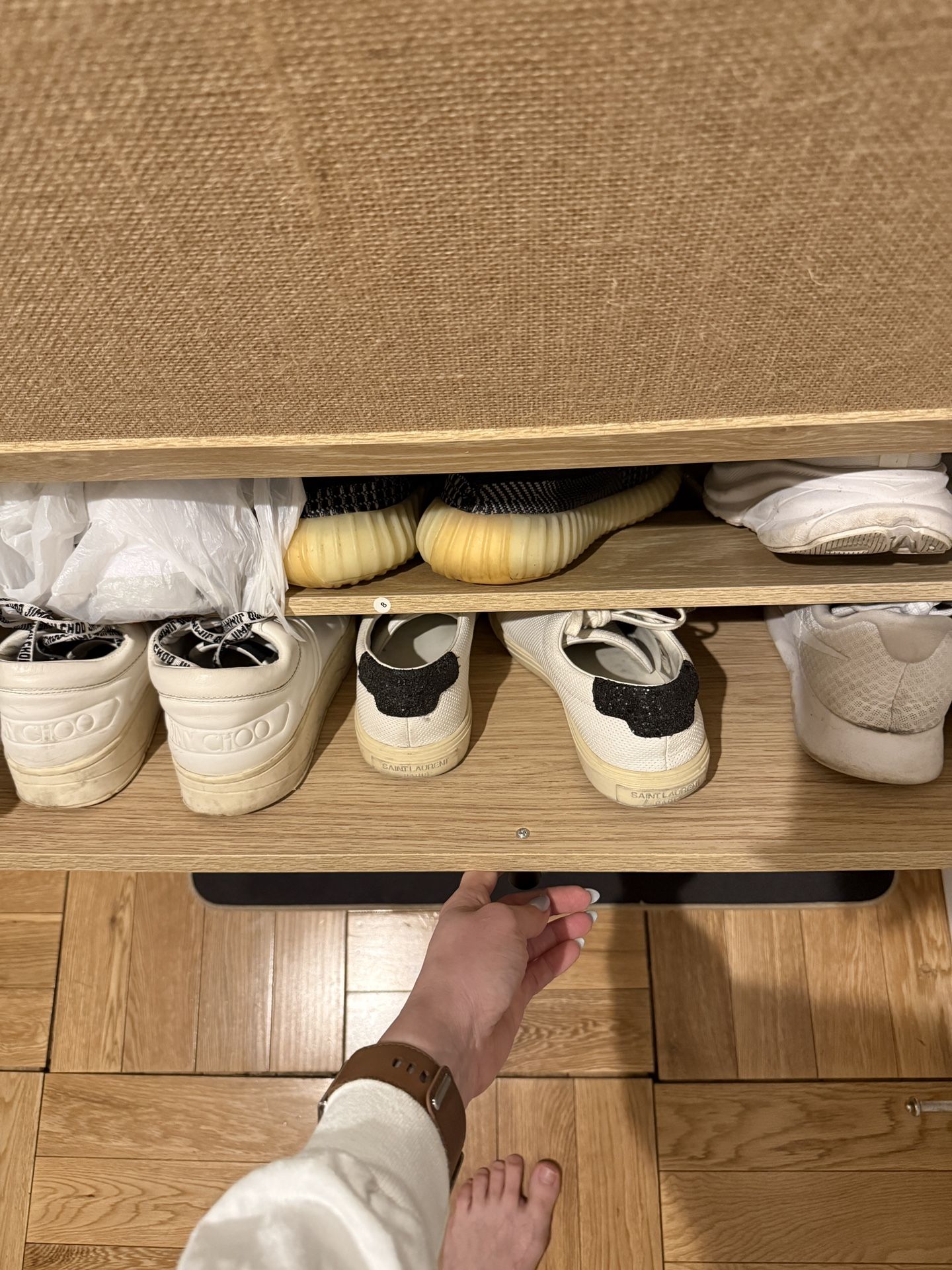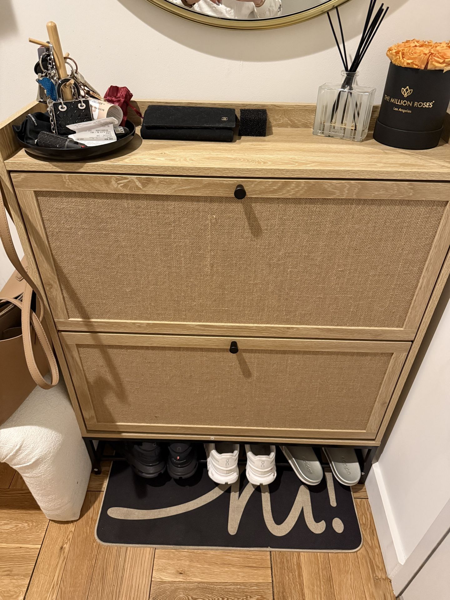 Super modern and sleek shoe cabinet for any entry way. Two shelves for your shoes and other items. 9.25”D x 31.5”W x 39.37”H. Color: Beige. Material: Wood. Item Height: 39-46 in. Item Width: 31-38 in. Brand: Amazon. Item Depth: Less than 12 in.