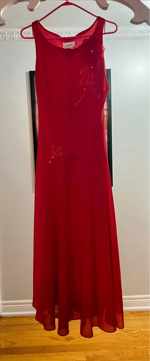 This elegant red evening dress features a sleeveless design and a flowy, floor-length skirt. A delicate floral embellishment with rhinestone accents adorns the bodice. It's perfect for formal events or special occasions!