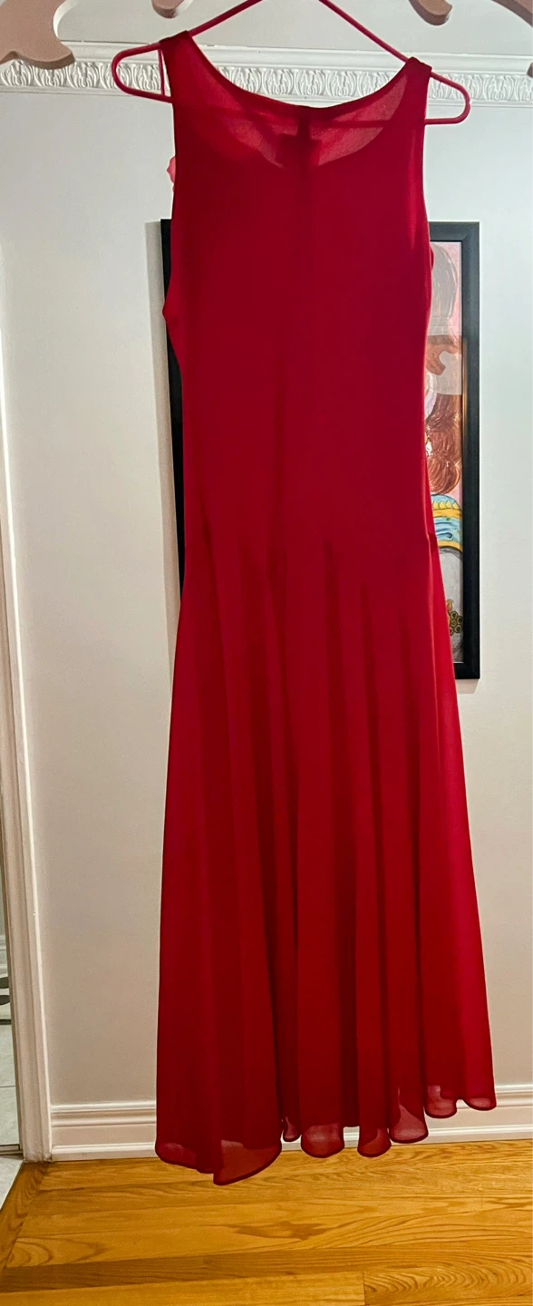 This elegant red evening dress features a sleeveless design and a flowy, floor-length skirt. A delicate floral embellishment with rhinestone accents adorns the bodice. It's perfect for formal events or special occasions!