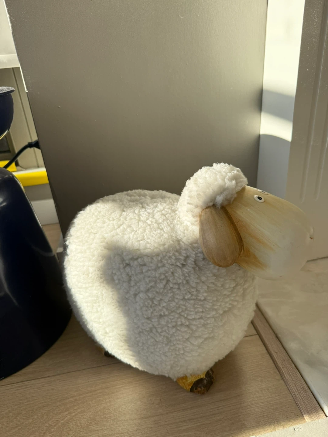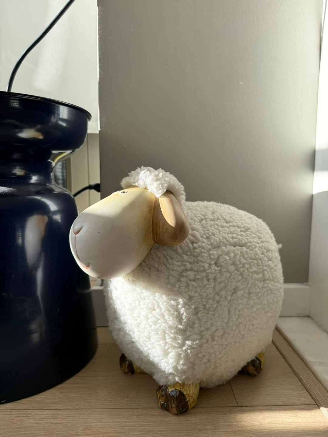 Large This is a cute, fluffy white sheep coin bank. It's perfect for saving up spare change! The sheep has a fuzzy texture and wooden accents on its face and feet.
