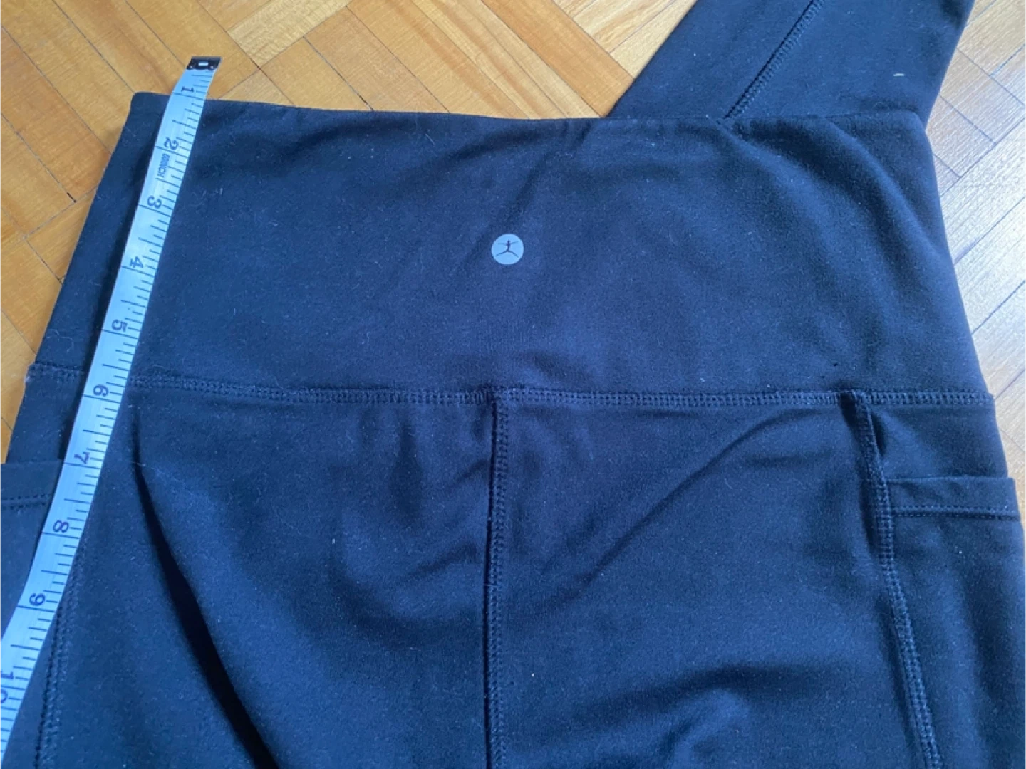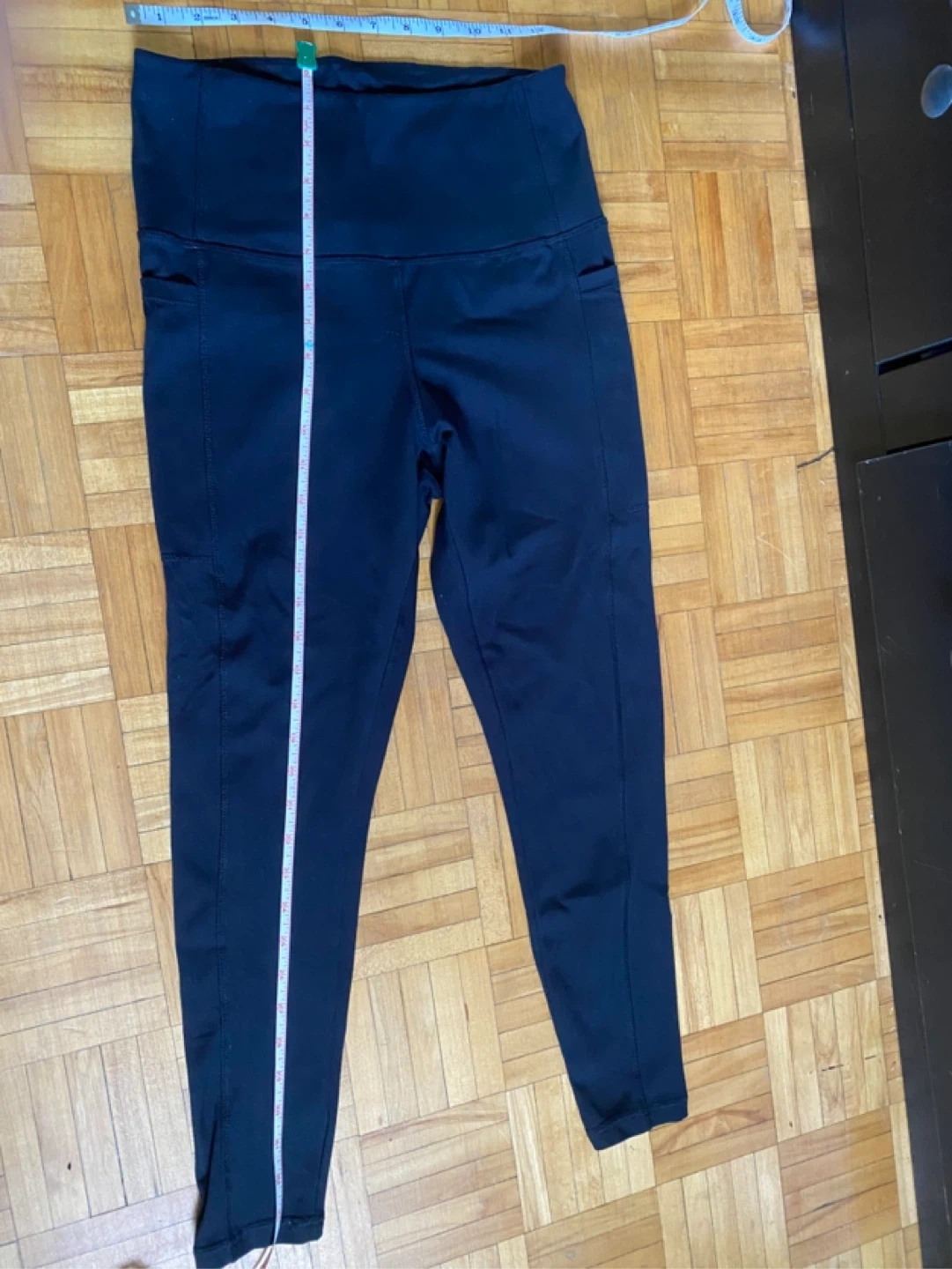 These black athletic leggings feature side pockets for convenience. They're made of a comfortable, stretchy material. The inseam measures approximately 27 inches. They're great for workouts or casual wear!
