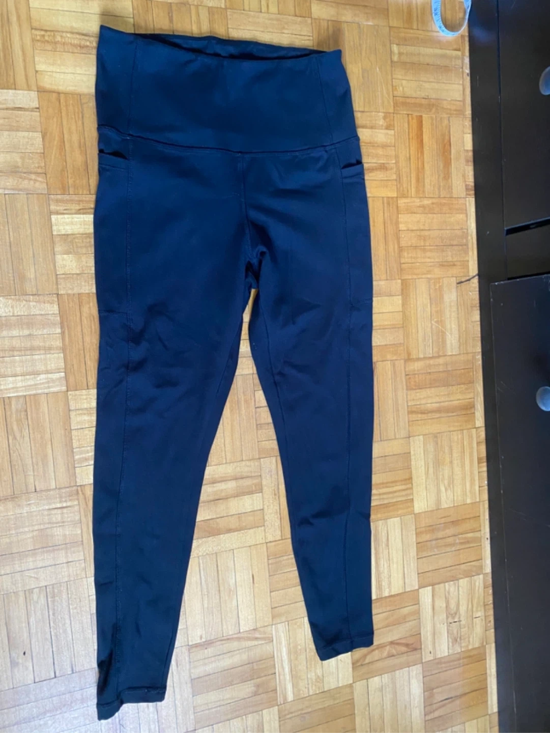 These black athletic leggings feature side pockets for convenience. They're made of a comfortable, stretchy material. The inseam measures approximately 27 inches. They're great for workouts or casual wear!