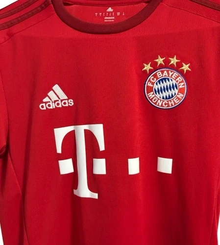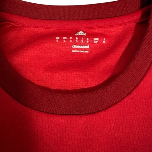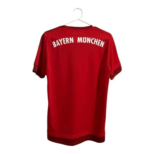 This is a 2015-16 FC Bayern Munich Home Jersey, a classic Adidas football shirt. It features a clean red design with claret accents and was worn during a dominant season where Bayern Munich won the Bundesliga and DFB-Pokal. The shirt is predominantly "true red" with "craft red" details on the cuffs and hem, featuring a ribbed crewneck and the iconic Adidas three stripes on the shoulders. It utilizes Climacool ventilation technology with mesh inserts to keep you cool and dry. Includes the embroidered FC Bayern Munich badge on the chest. Size: Small Men’s. Pit to pit: 17.5”, Length: 26”.