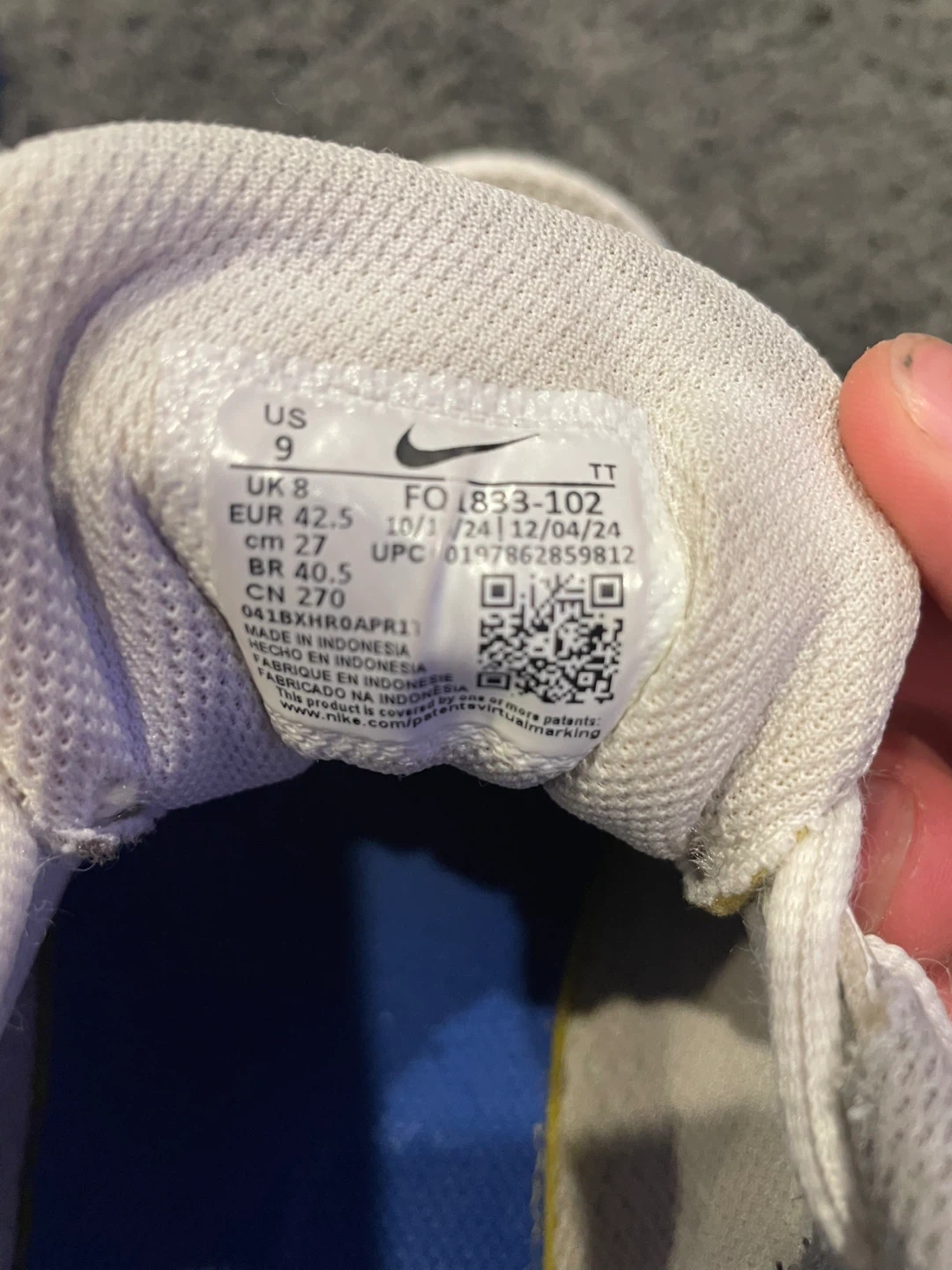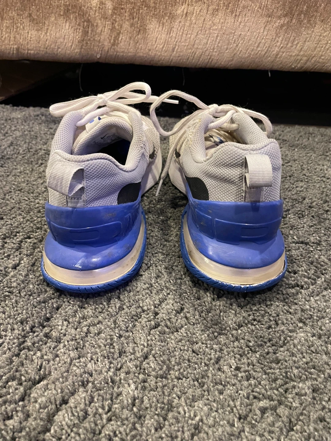 These are Nike Air Max sneakers. They're white and blue with a mesh upper. Size 9 US.