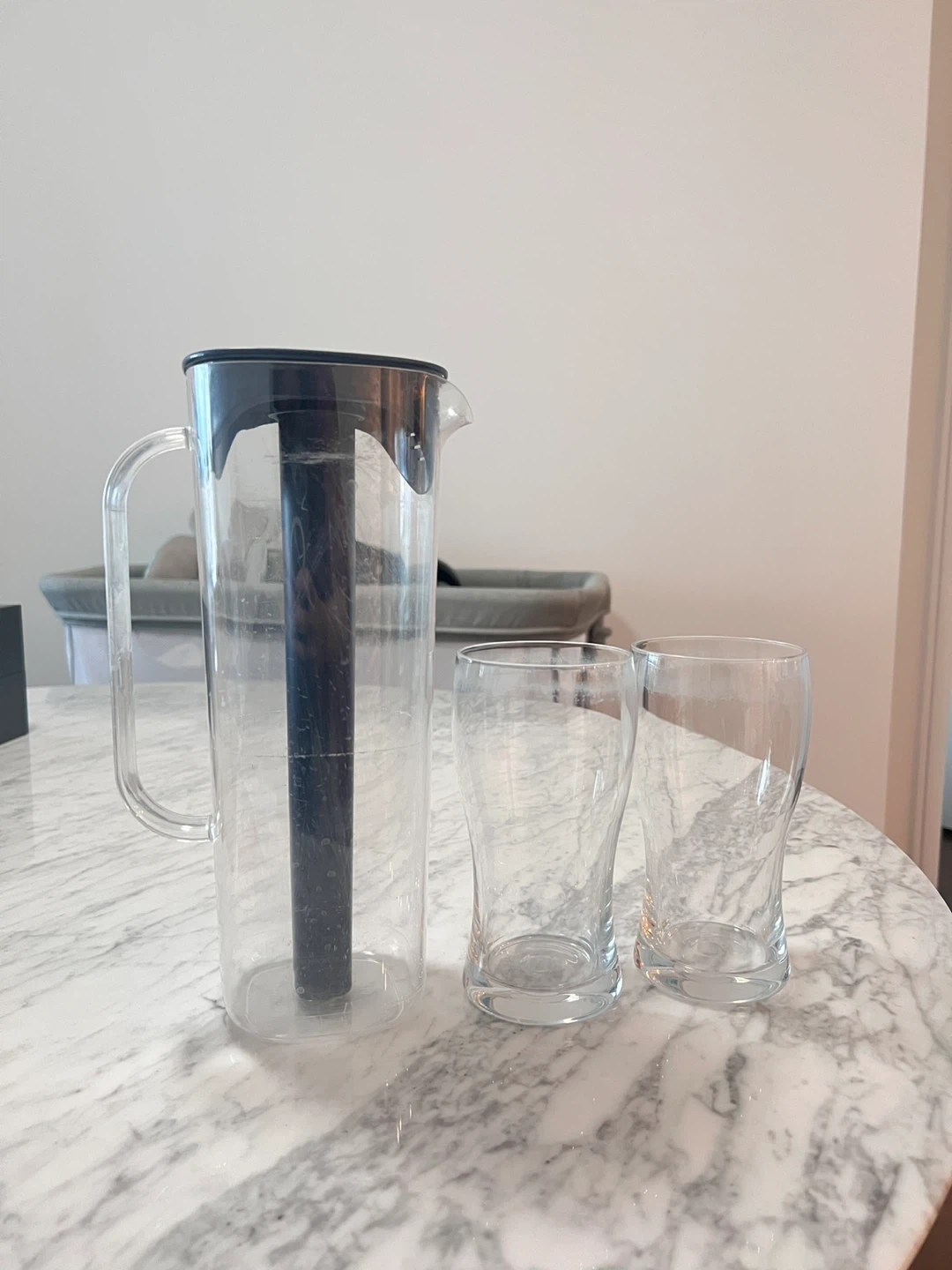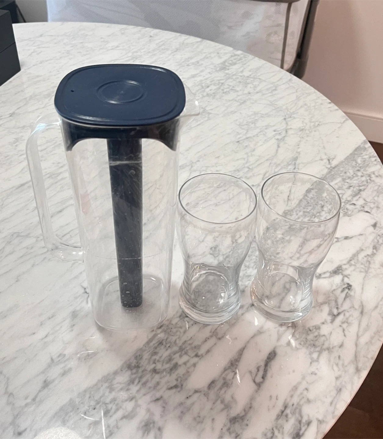 73Selling a clear pitcher with a blue lid, along with two matching glasses. Perfect for serving water, juice, or iced tea! The pitcher has a built-in ice core to keep your drinks cool without diluting them. Great for gatherings or everyday use