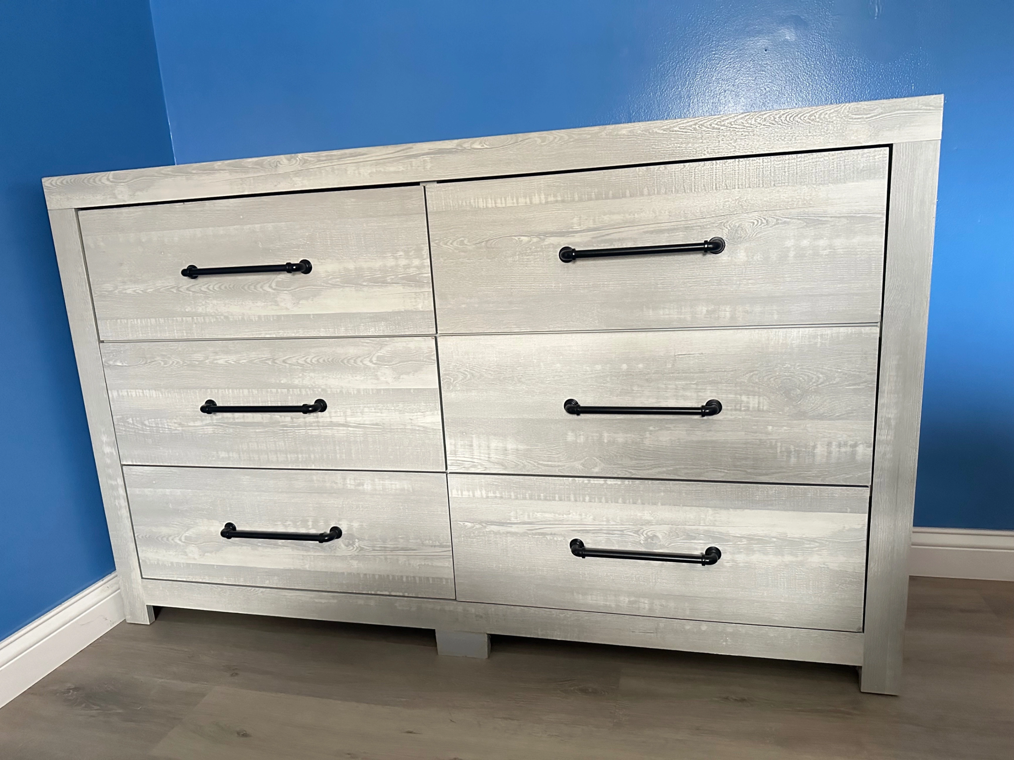 Selling a lovely 6-drawer dresser! It features a whitewashed wood finish and stylish black handles. A great addition to any bedroom for extra storage