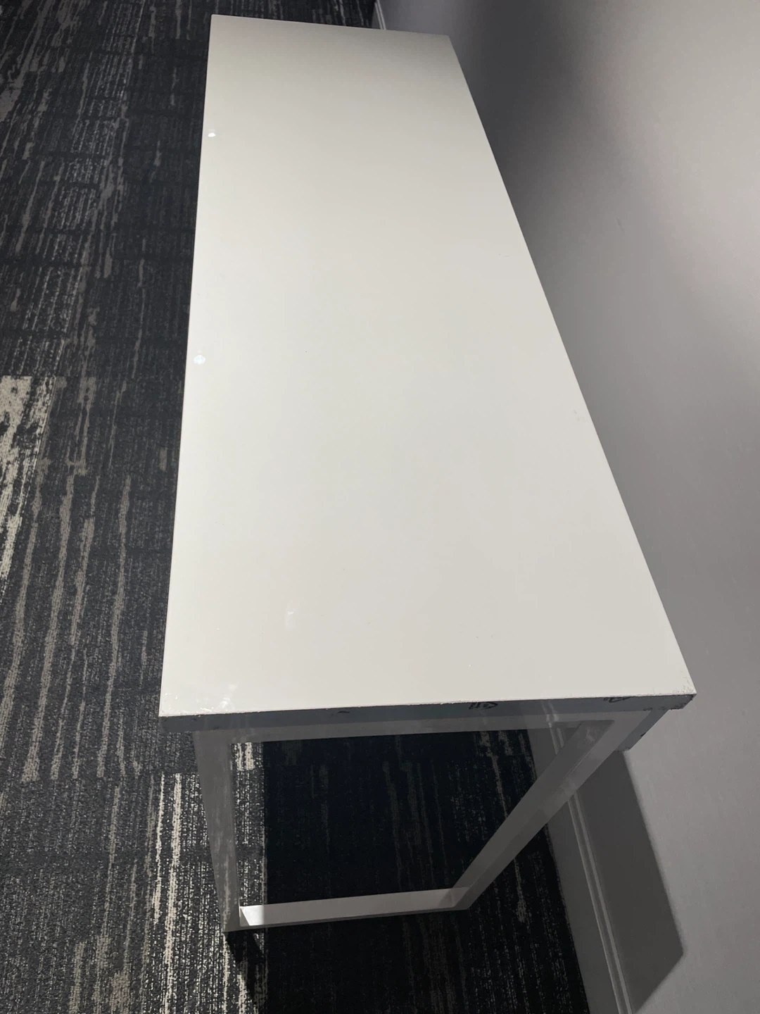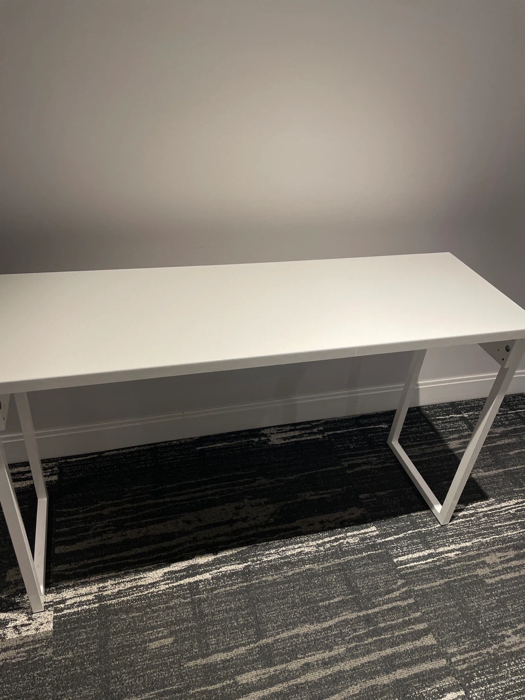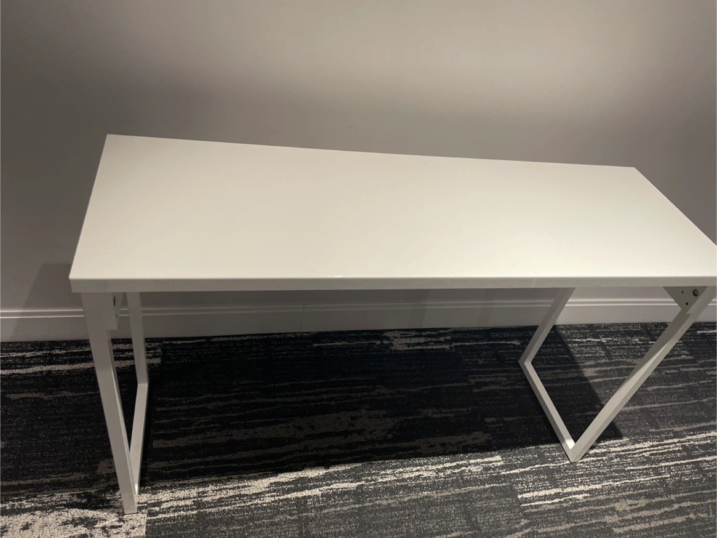 It's a white desk with a sleek design. The legs are made of white metal and are A-shaped. This desk is perfect for a home office or study space.