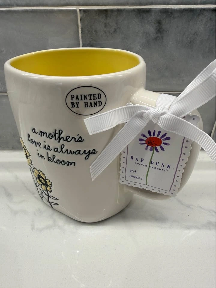 Rae Dunn Mug ~ NEW! A MOTHERS LOVE IS ALWAYS IN BLOOM ~ white & yellow πΌππ