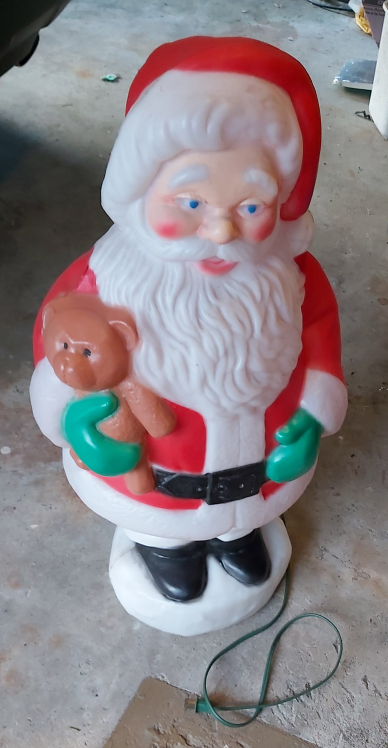 plastic Santa Claus decoration. It's a cute addition to any holiday display. It features Santa holding a teddy bear.