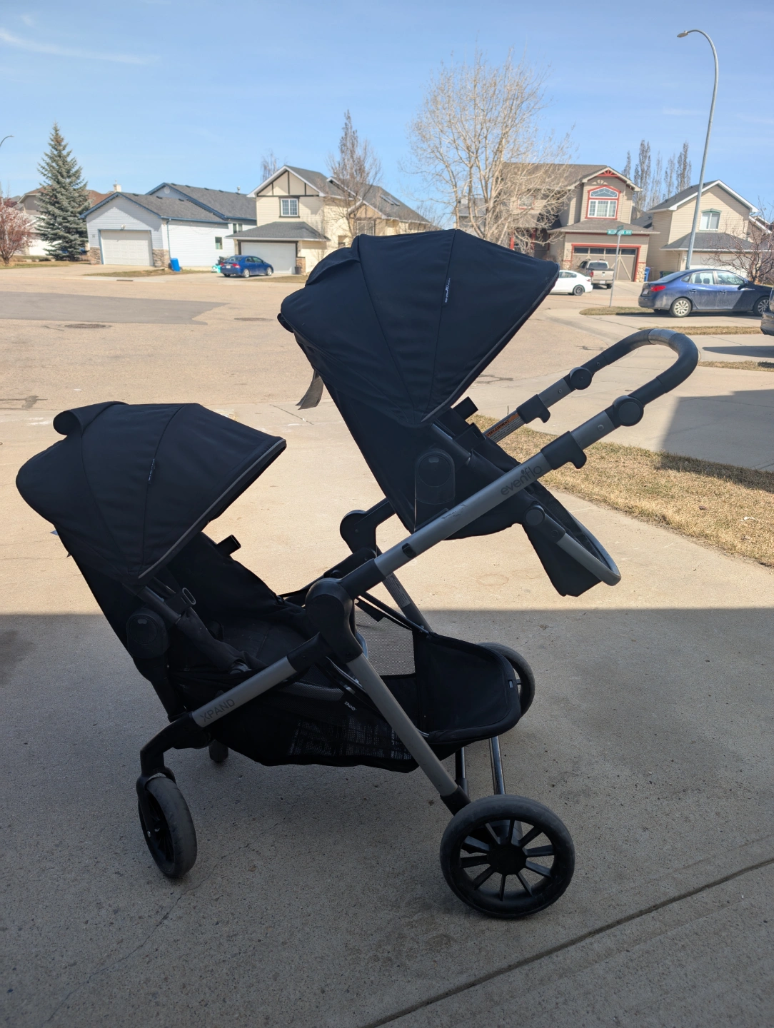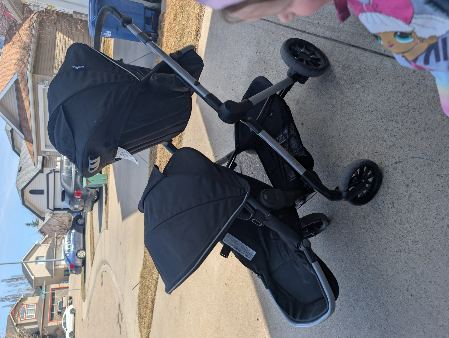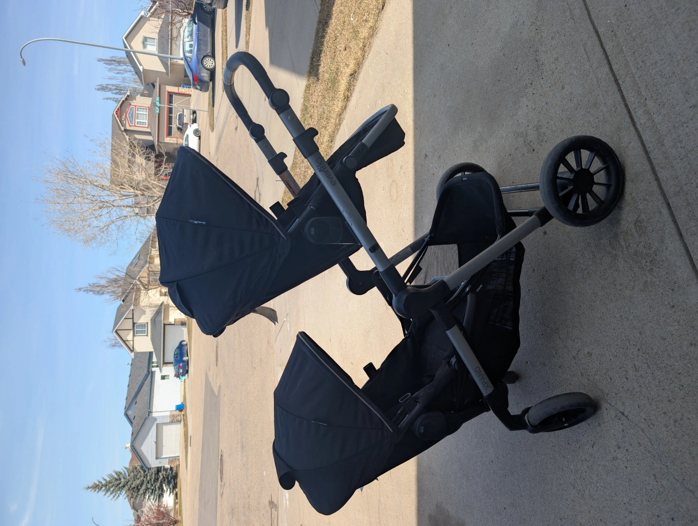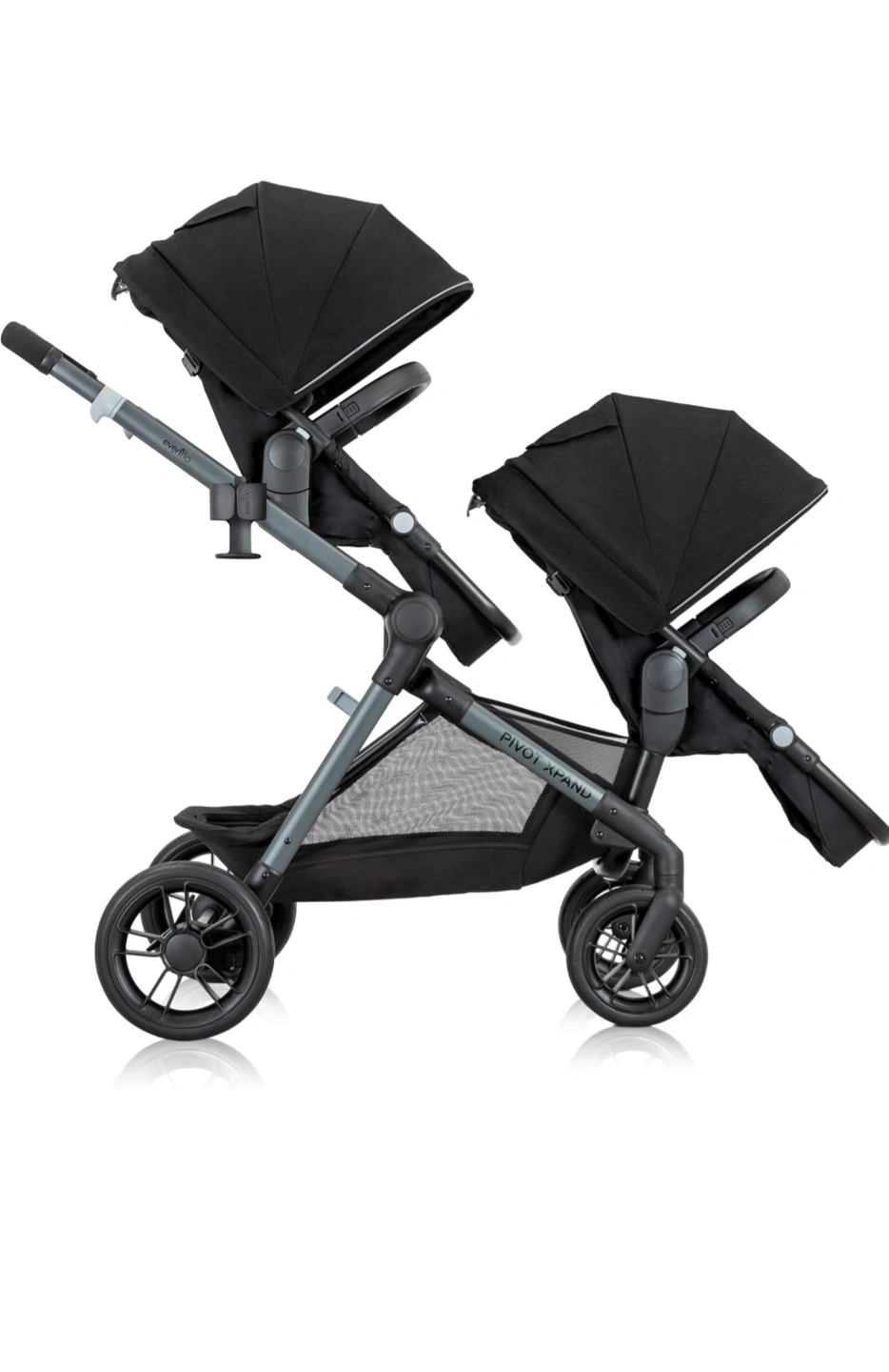 Pivot explore Xpand, come with 2 bassent to toddler seats with lots of options for laying or even putting your feet up and just relaxing while eating your favorite snacks.